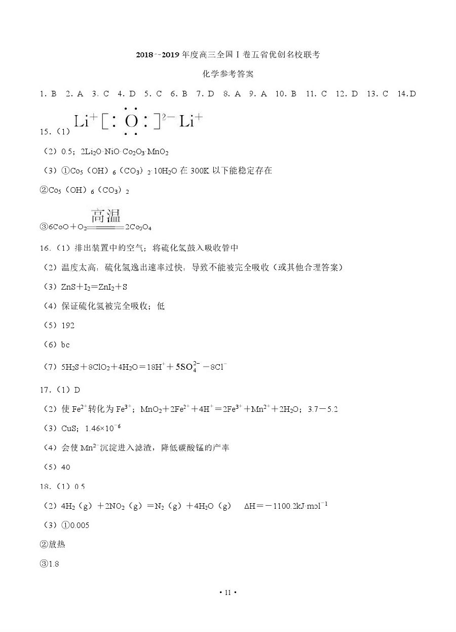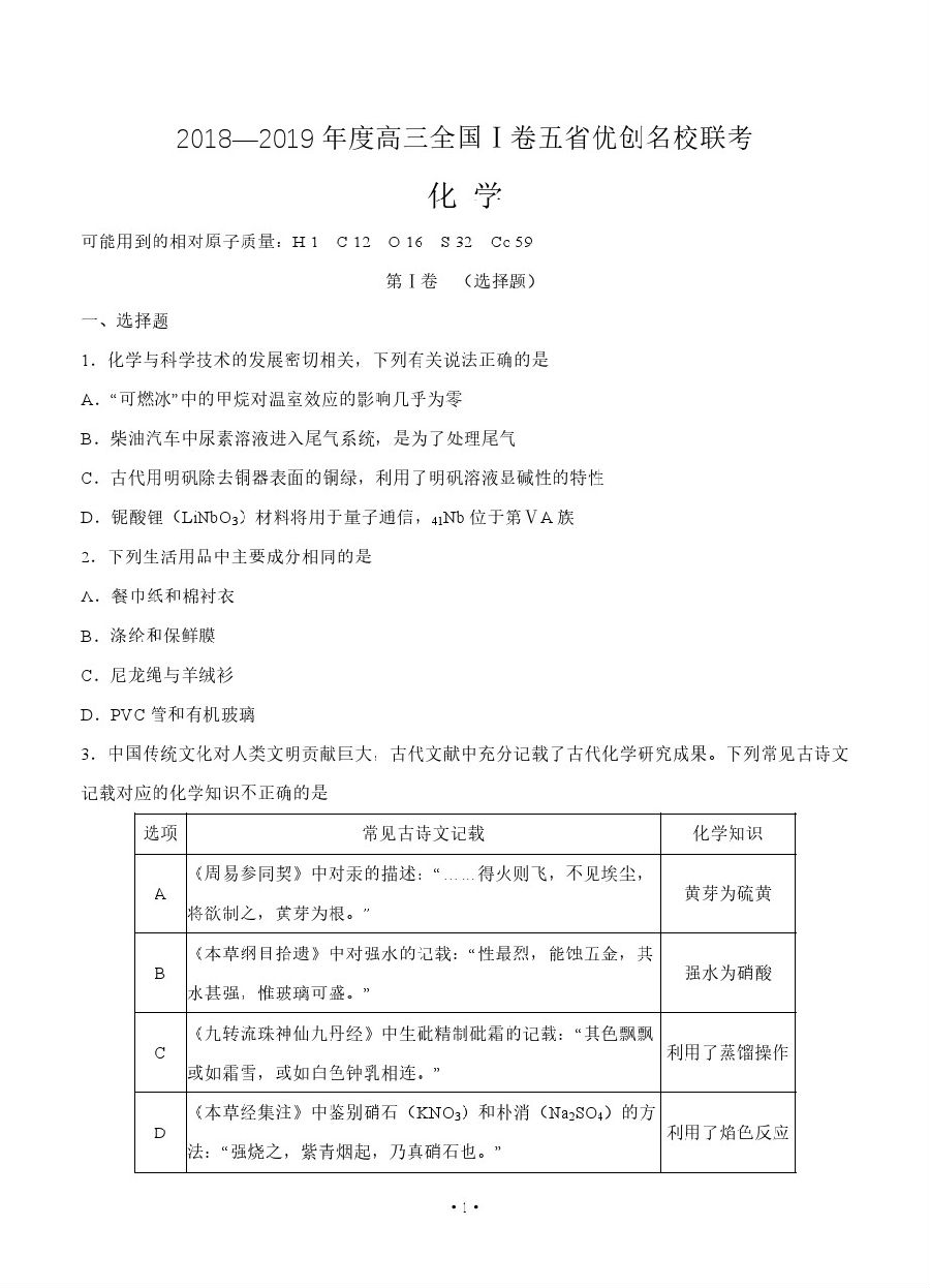 【摘要】2018-2019高三全國I卷五省優(yōu)創(chuàng)名校聯(lián)考化學試題及參考答案!更多高考信息可關(guān)注閩州教育高考資訊專欄。