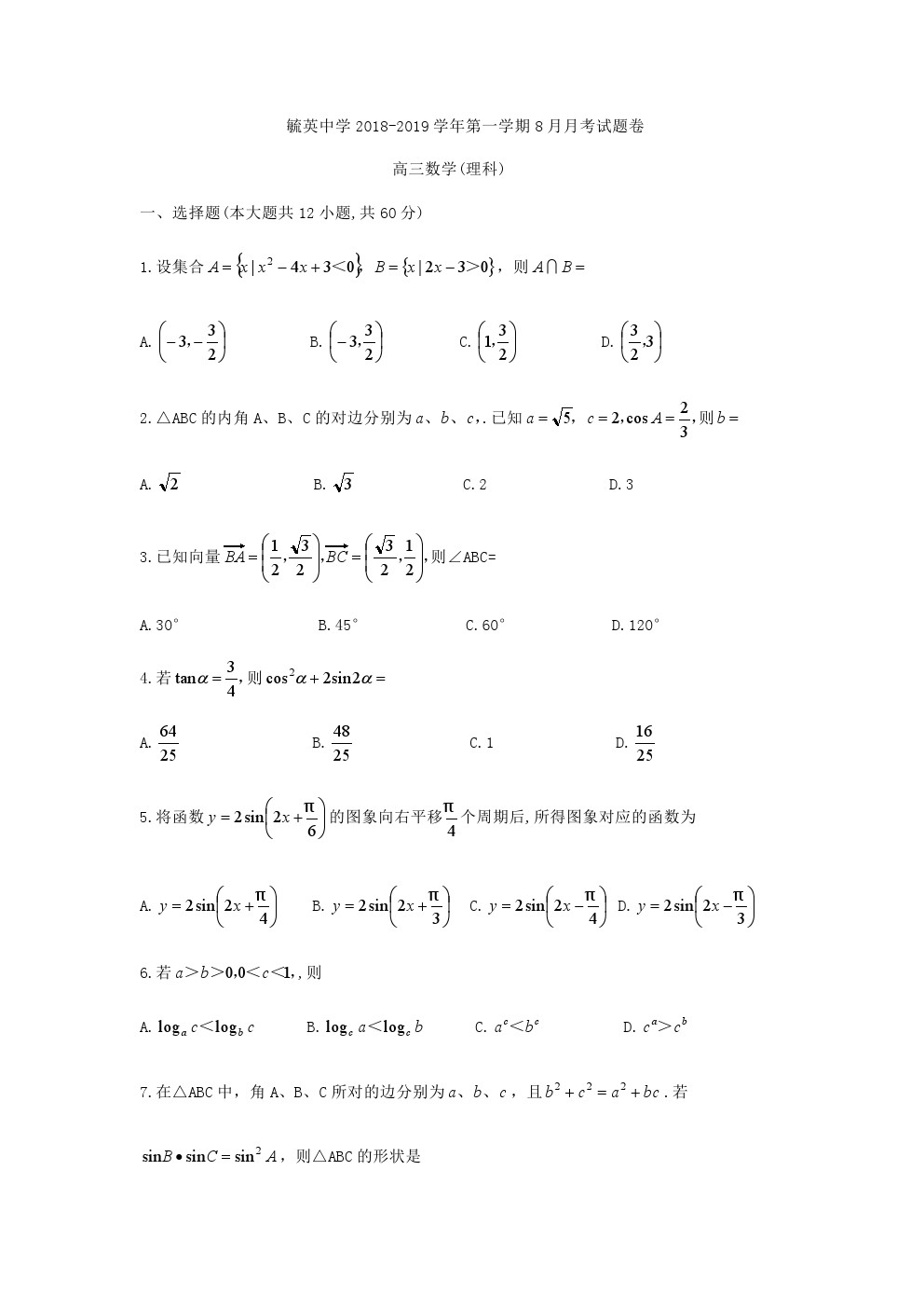 【摘要】福建省晉江市毓英中學2018-2019學年高三上8月月考數(shù)學試題(無答案)。更多高考信息可關注閩州教育高考資訊專欄。