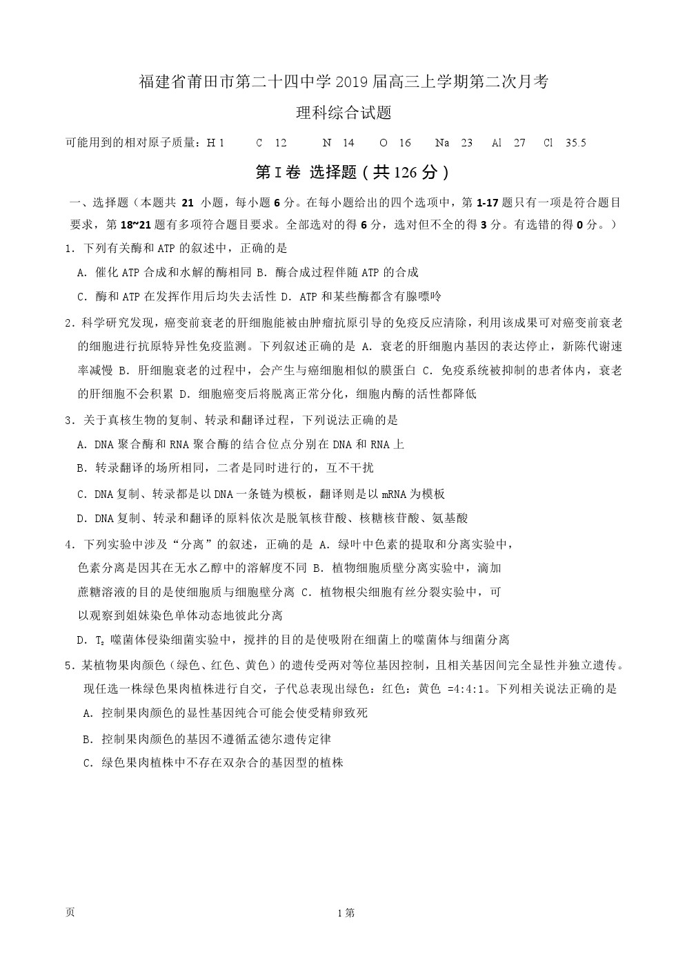【摘要】福建省莆田市第二十四中學(xué)2019屆高三上學(xué)期第二次月考試題理科綜合生物試題及答案!更多的相關(guān)信息可關(guān)注閩州教育高考資訊專欄。