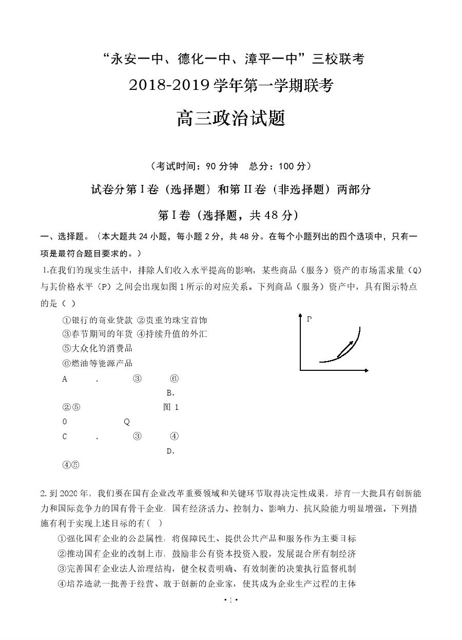 【摘要】2019“永安一中、德化一中、漳平一中”高三12月三校聯(lián)考政治試題及參考答案!更多高考信息可關(guān)注閩州教育高考資訊專欄。