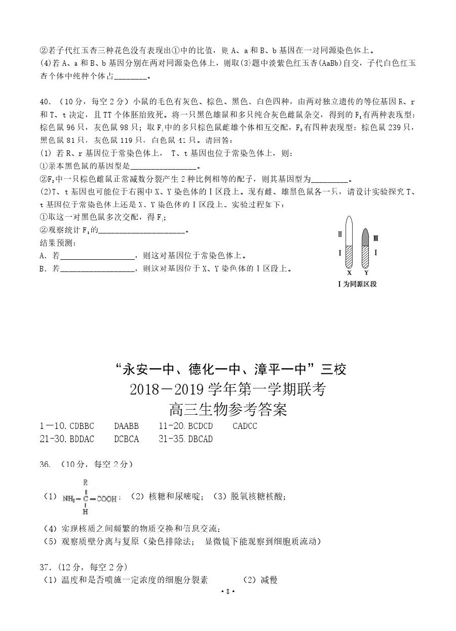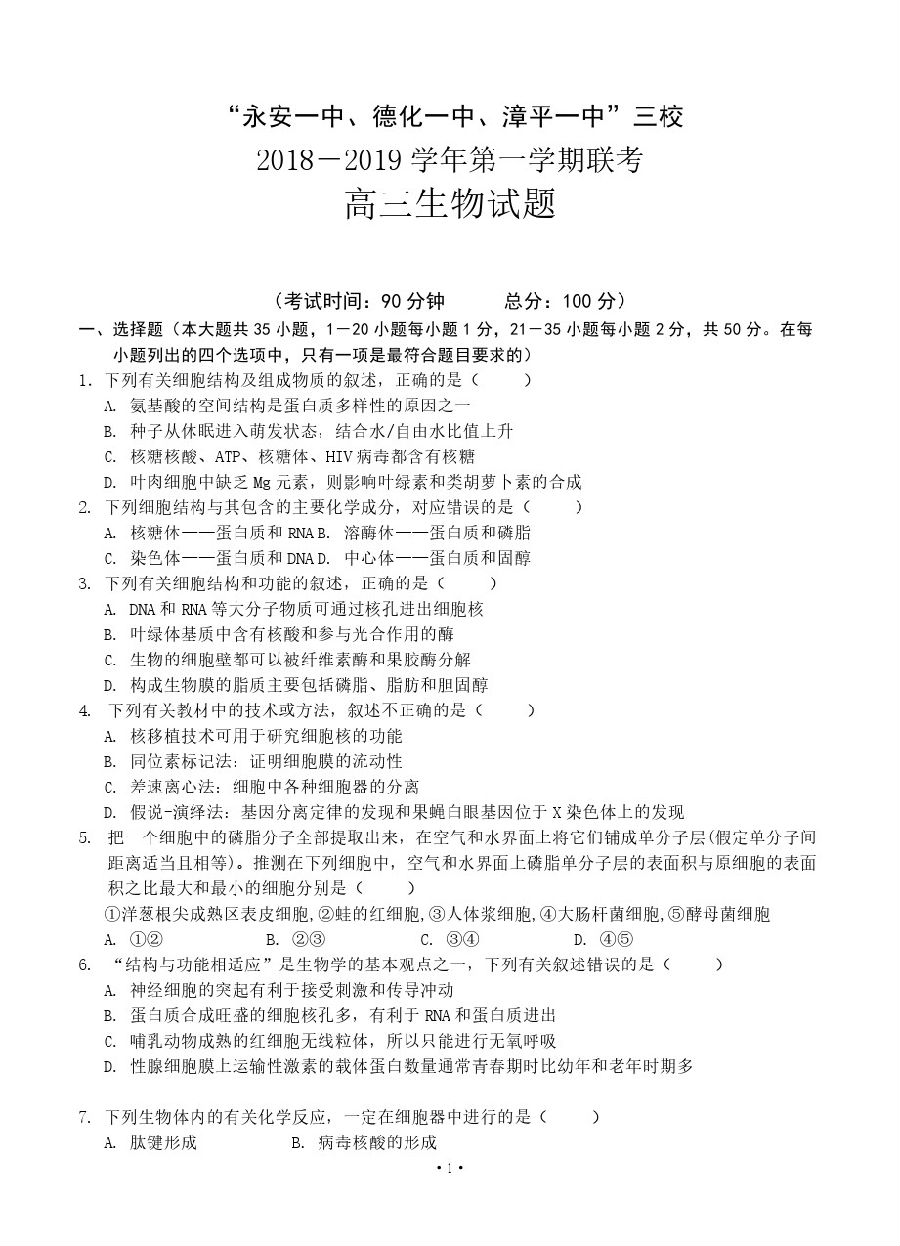 【摘要】2019“永安一中、德化一中、漳平一中”高三12月三校聯(lián)考生物試題及參考答案!更多高考信息可關(guān)注閩州教育高考資訊專欄。