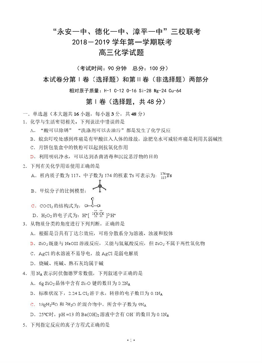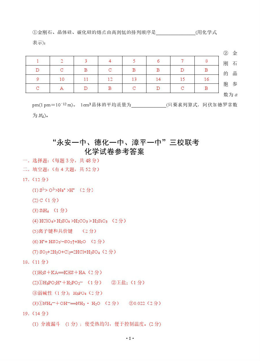 【摘要】2019“永安一中、德化一中、漳平一中”高三12月三校聯(lián)考化學(xué)試題及參考答案!考生們可以針對題目來更好的復(fù)習(xí)哦,更多高考信息可關(guān)注閩州教育高考資訊專欄。