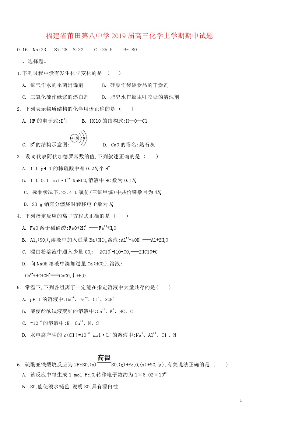 【摘要】福建省莆田第八中學(xué)2019屆高三化學(xué)上學(xué)期期中試題!更多高考信息可關(guān)注閩州教育高考資訊專欄。
