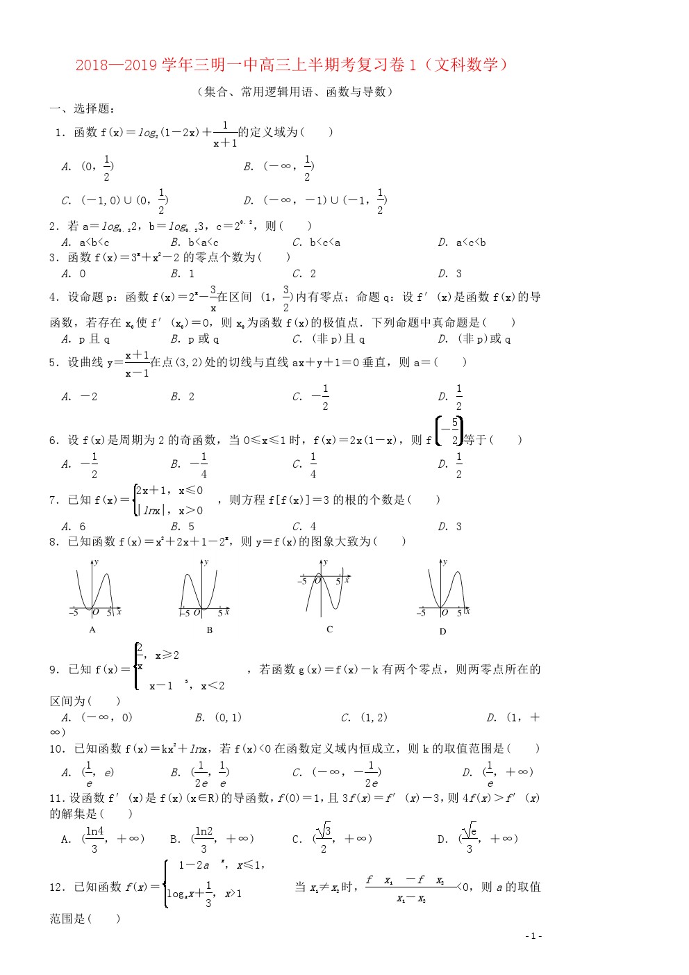 【摘要】福建省三明市第一中學(xué)2019屆高三文科數(shù)學(xué)上學(xué)期半期考復(fù)習(xí)卷1!更多高考信息可關(guān)注閩州教育高考資訊專欄。