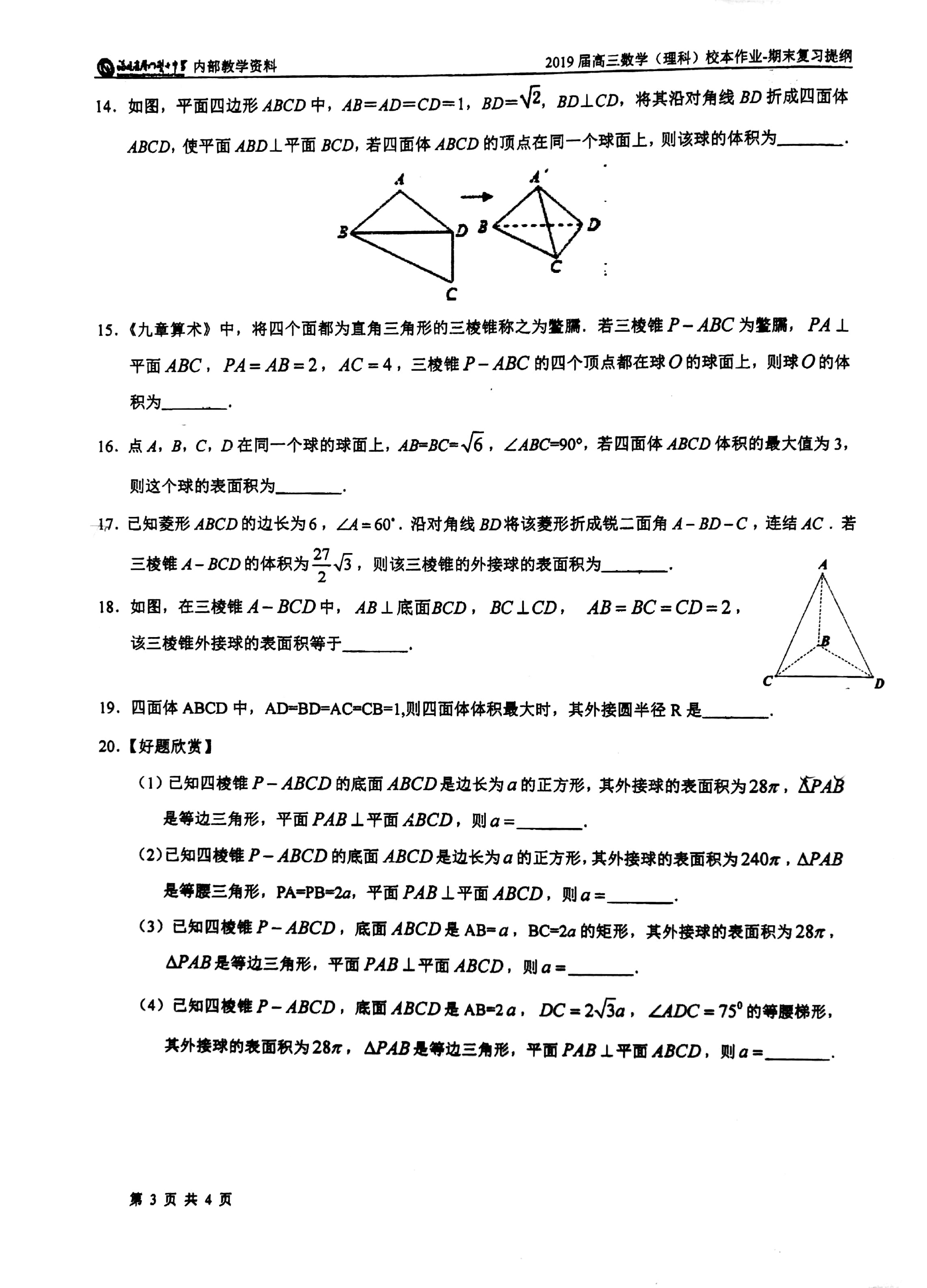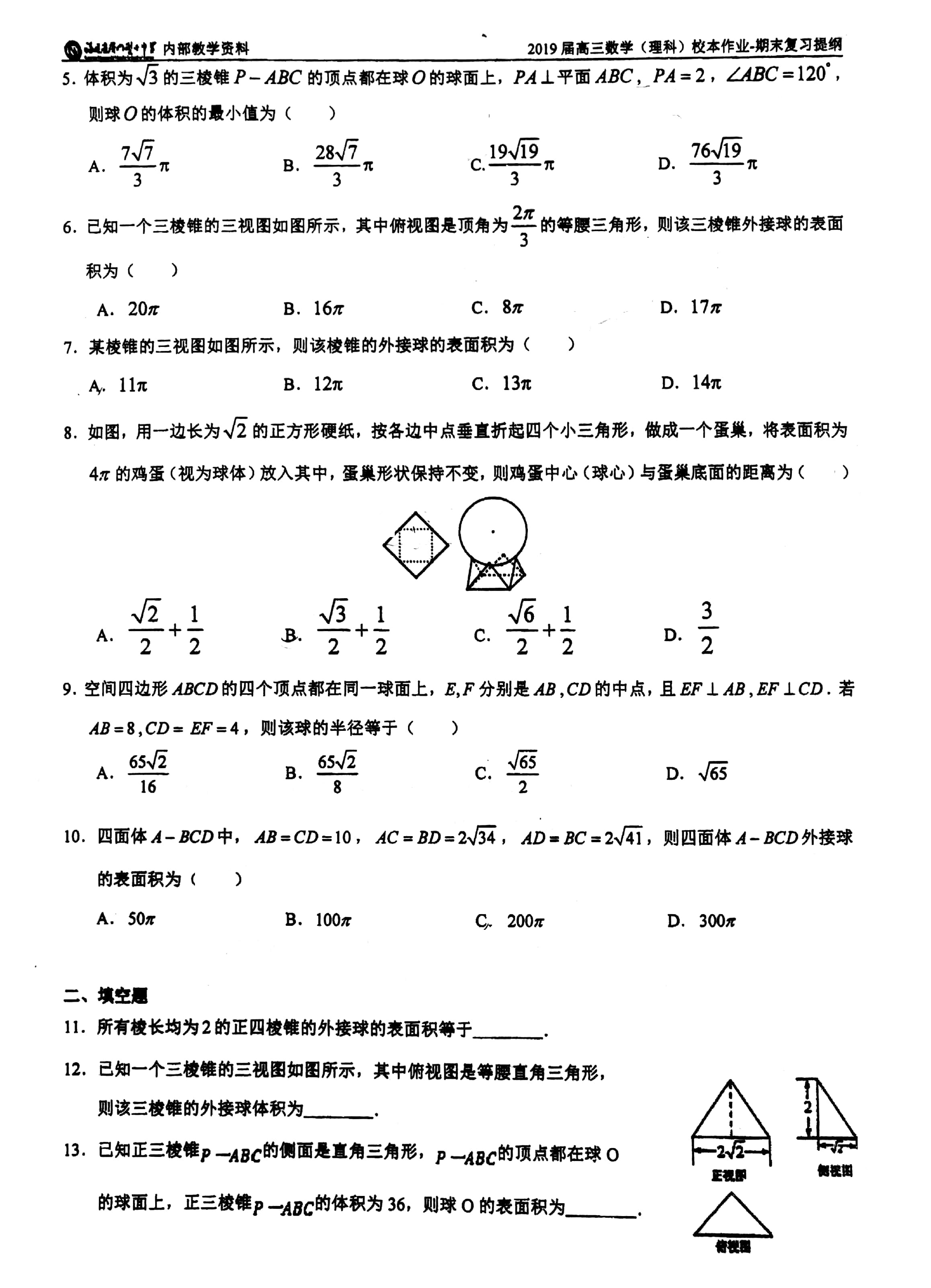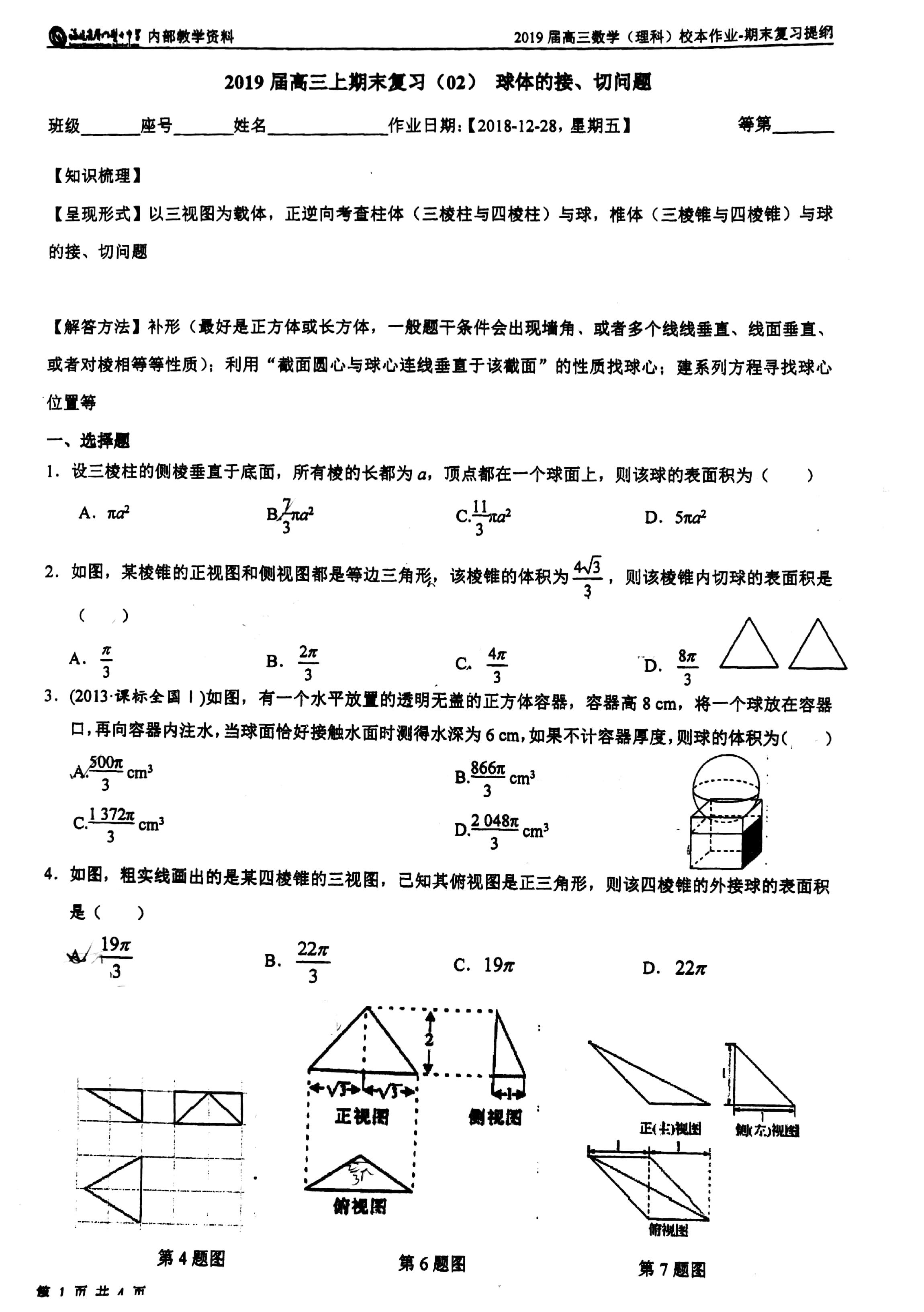 【摘要】福建廈門雙十中學(xué)2019屆高三上期末復(fù)習(xí)理科數(shù)學(xué)-球體的接切問題!更多高考信息可關(guān)注閩州教育高考資訊專欄。