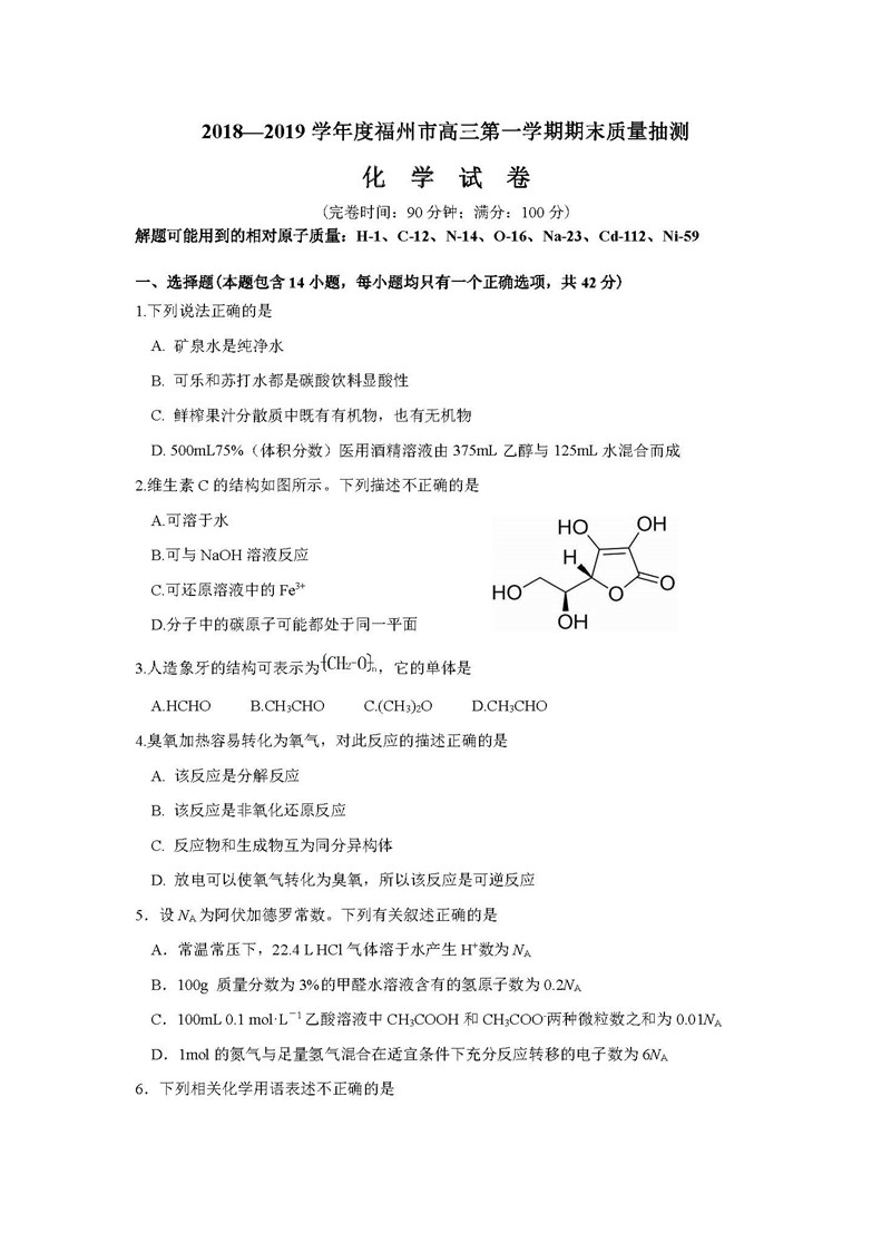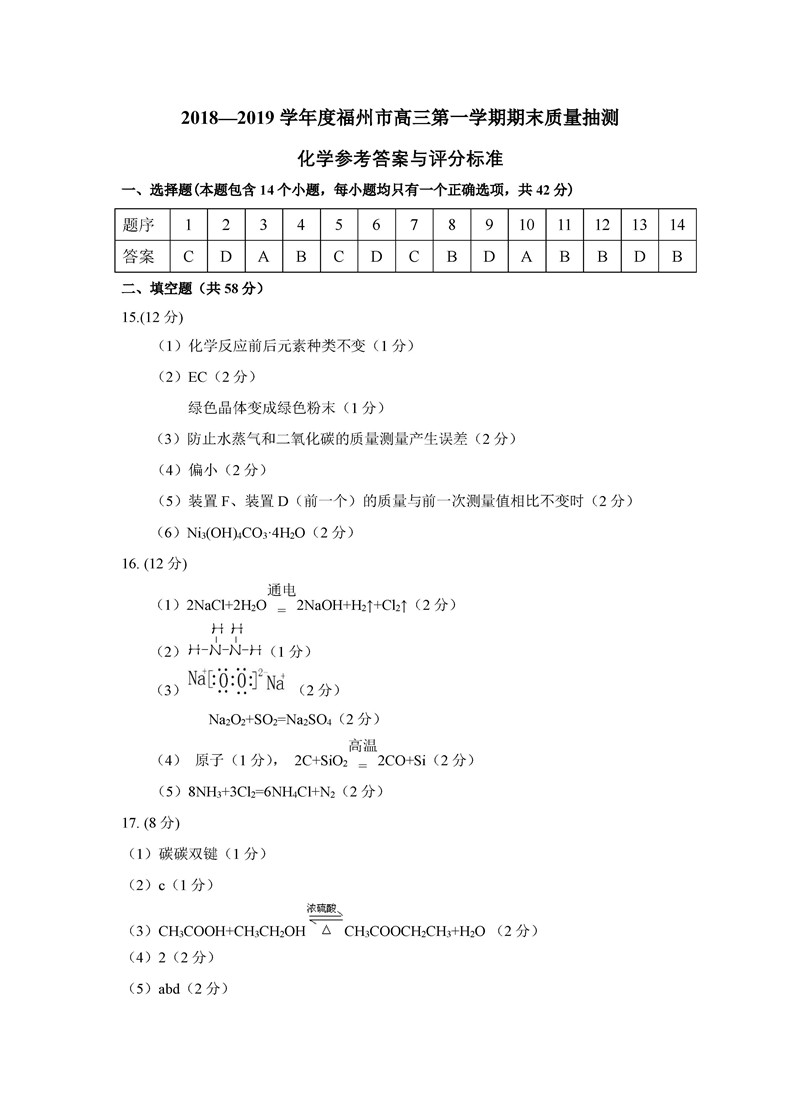 【摘要】2019福建省福州市高三上學(xué)期期末質(zhì)檢化學(xué)試題及答案,更多高考信息可關(guān)注閩州教育高考資訊專欄。