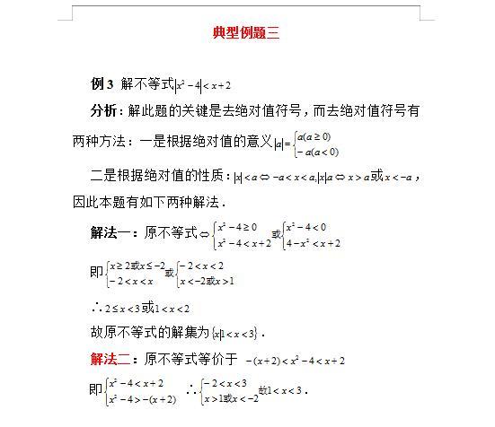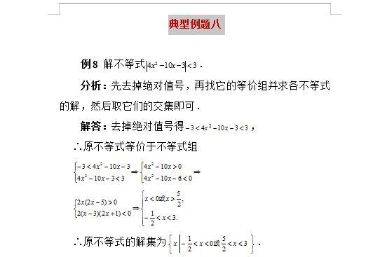 說明:解含絕對值的不等式,關(guān)鍵是要把它化為不含絕對值的不等式,然后把不等式等價轉(zhuǎn)化為不等式組,變成求不等式組的解。
