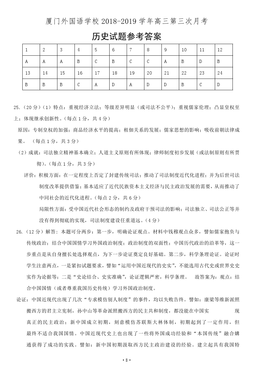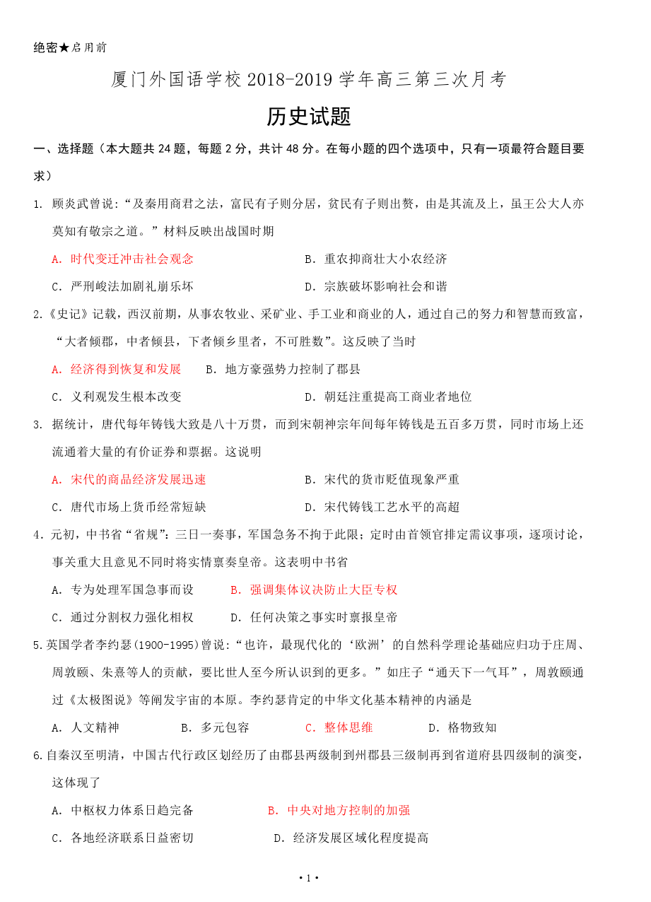 【摘要】福建省廈門(mén)外國(guó)語(yǔ)學(xué)校2019屆高三第三次月考?xì)v史試題及答案!更多高考信息可關(guān)注閩州教育高考資訊專欄。