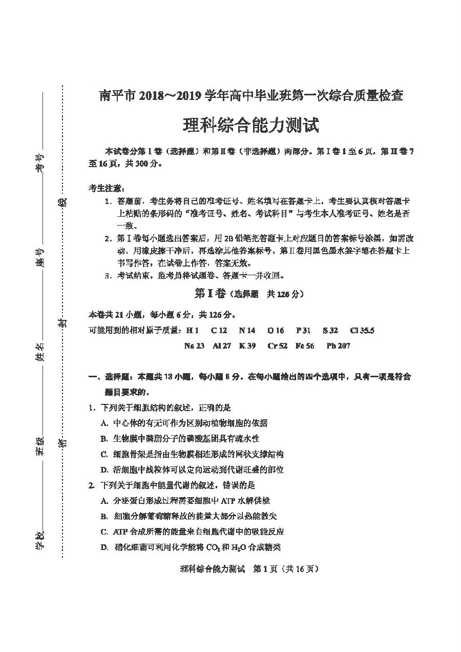 【摘要】福建省南平市2019學(xué)年高中畢業(yè)班第一次綜合質(zhì)量檢查理綜試題及答案。更多的相關(guān)信息可關(guān)注閩州教育高考資訊專欄。