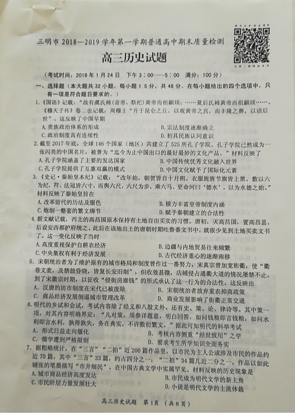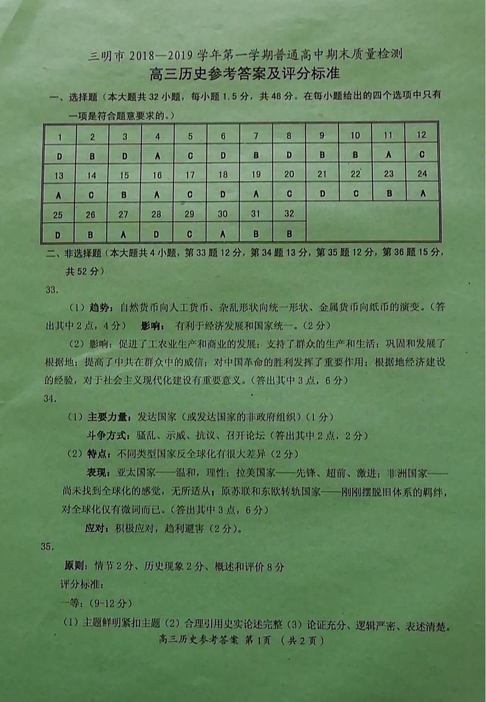 【摘要】福建省三明市2019屆高三上學(xué)期期末質(zhì)量檢測歷史試題及答案!更多高考信息可關(guān)注閩州教育高考資訊專欄。