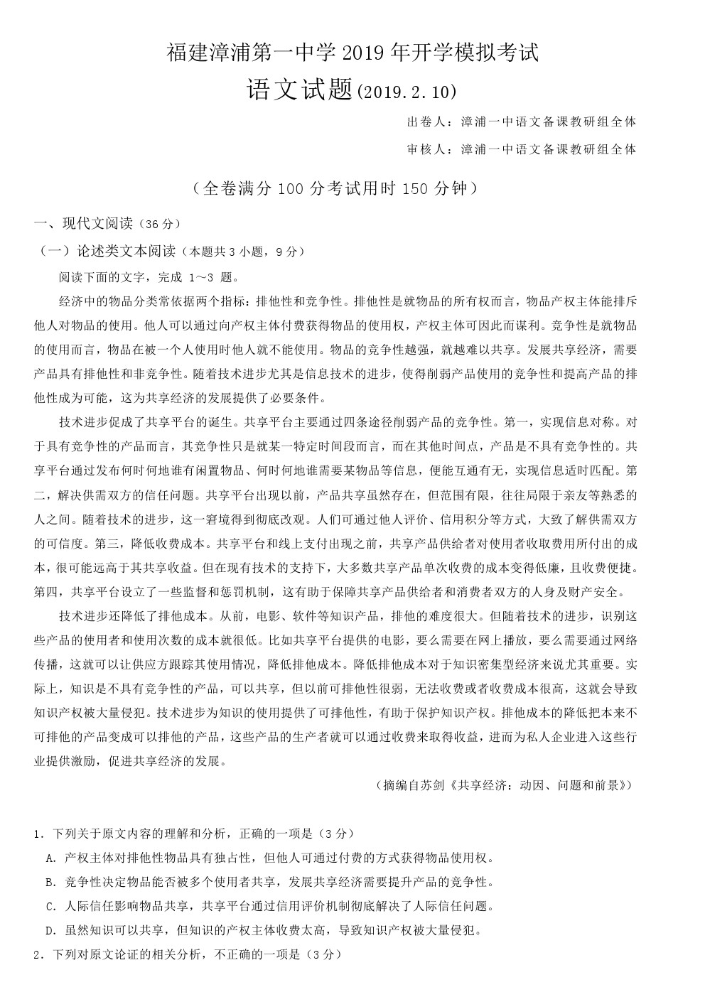 【摘要】福建省漳浦第一中學2019年開學模擬考試語文試題及答案,考生們可以針對題目來更好的復(fù)習哦,更多高考信息可關(guān)注閩州教育高考資訊專欄。
