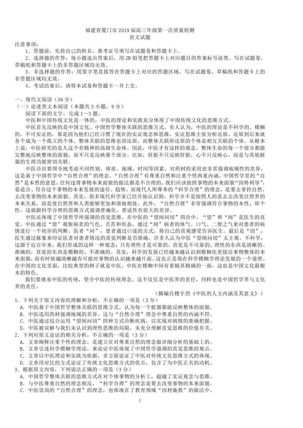 【摘要】福建省廈門市2019屆高三年級第一次質(zhì)量檢測語文試題及答案!更多高考信息可關(guān)注閩州教育高考資訊專欄。