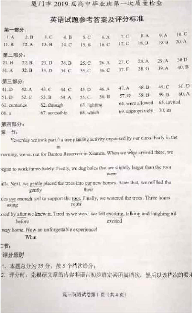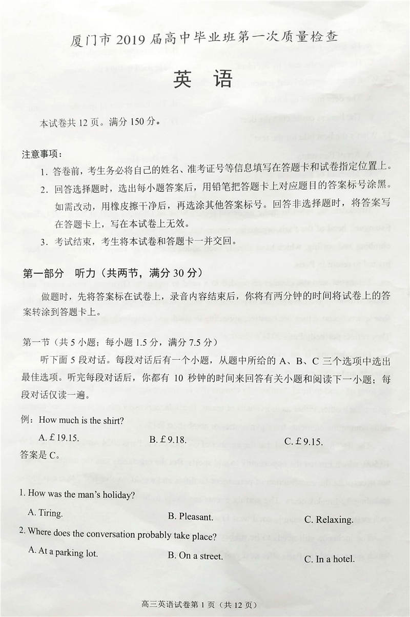 【摘要】福建省廈門市2019屆高三年級第一次質量檢測英語試題及答案,更多高考信息可關注閩州教育高考資訊專欄。