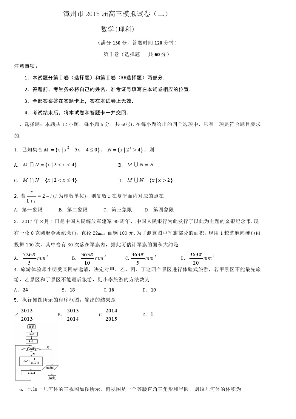 【摘要】福建省漳州2018屆高三考前模擬考試(二)數(shù)學(xué)(理)試題試題及答案!更多高考信息可關(guān)注閩州教育高考資訊專欄。
