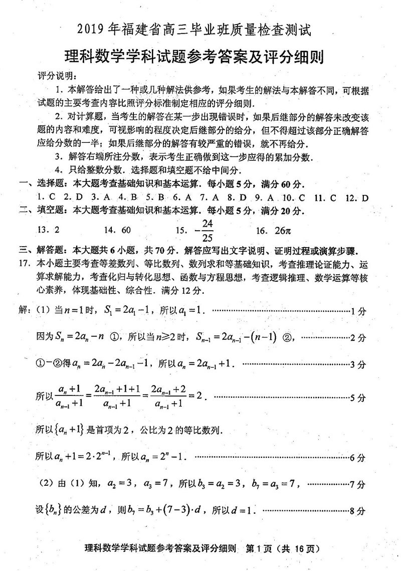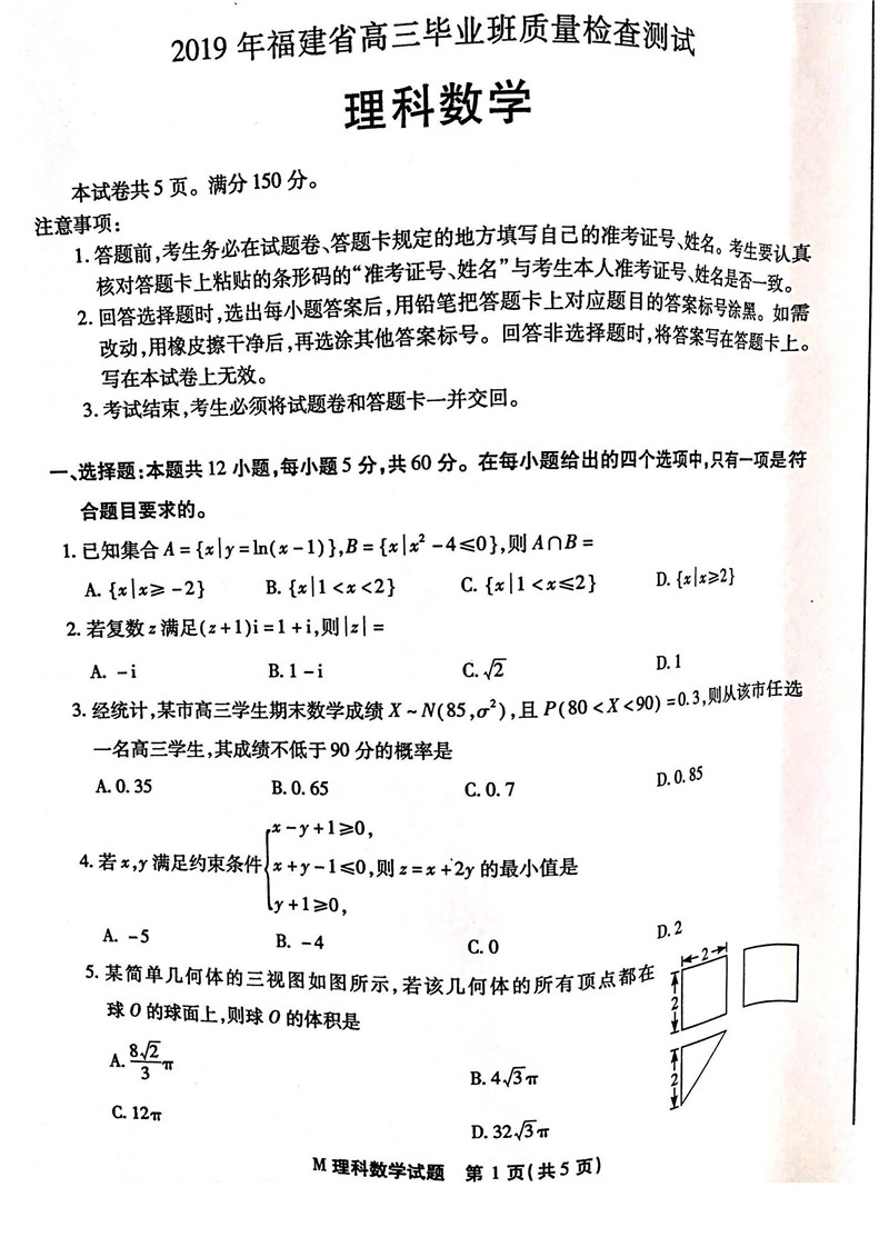 【摘要】2019年福建省高三畢業(yè)班質量檢查測試數(shù)學(理)試題及答案!更多的相關信息可關注閩州教育高考資訊專欄。