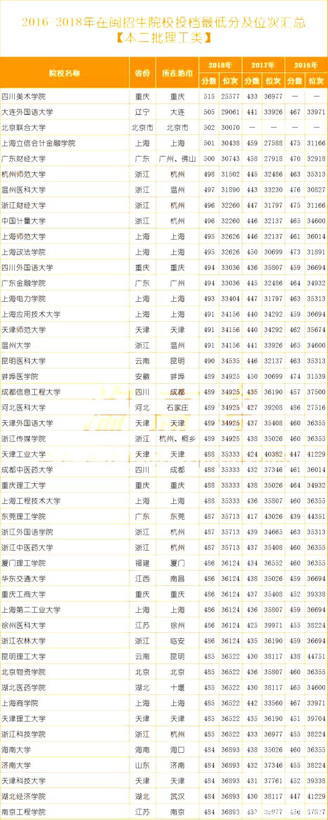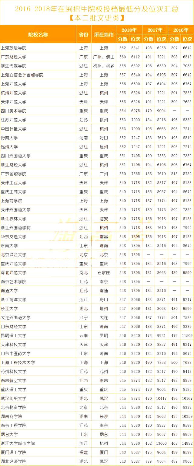 為此,小編整理了一份2016-2018年本二批次在閩招生各院校投檔最低分及位次(數(shù)據(jù)),對于目前正在填報(bào)志愿的高考生和家長來說極其重要,同時(shí),也希望能夠幫助到更多的家長和學(xué)生們。