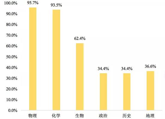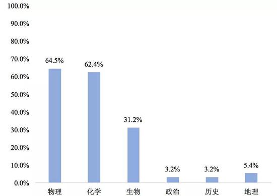 在《教育部指引》的93個(gè)專(zhuān)業(yè)類(lèi)的選考要求中,提及最多的是科目是物理,共被60個(gè)專(zhuān)業(yè)類(lèi)提及(不含允許無(wú)要求的專(zhuān)業(yè)類(lèi)),占專(zhuān)業(yè)類(lèi)總數(shù)的64.5%;其次是化學(xué),被58個(gè)專(zhuān)業(yè)類(lèi)提及,占62.4%;再次是生物,被29個(gè)專(zhuān)業(yè)類(lèi)提及,占31.2%。