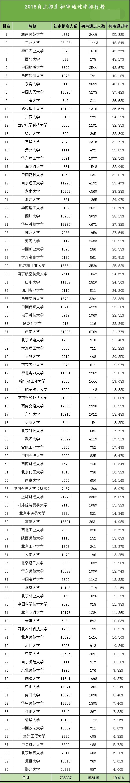 2018自招難度排行榜(初審) 一、排行分析 1、總體來(lái)看2018年自主招生共有78萬(wàn)人次報(bào)名(不含清北領(lǐng)軍、博雅計(jì)劃),共有15萬(wàn)人次通過(guò)自招初審,總體的初審?fù)ㄟ^(guò)率為19.41%。 15萬(wàn)的初審人數(shù)說(shuō)實(shí)話已經(jīng)很高了,18年應(yīng)屆生里,有學(xué)科競(jìng)賽獎(jiǎng)項(xiàng)的估計(jì)都不足5萬(wàn)人,因此,只要你不太好高騖遠(yuǎn),實(shí)際一點(diǎn),提前做好相關(guān)的調(diào)研,不管你是省一、省二還是省三,通過(guò)一所甚至幾所高校的自招初審都是比較有把握的。 2、2018年湖南師范以56%的初審?fù)ㄟ^(guò)率成為國(guó)內(nèi)初審最好通過(guò)的院校,這也是唯一一個(gè)初審率高于50%的高校。不過(guò)湖南師范只面向湖南本省招生,若只看面向全國(guó)招生的高校,那蘭州大學(xué)為第一名,且11000的初審人數(shù)也是國(guó)內(nèi)第一,自成一檔。 3、縱觀排行榜前列的高校,主要可以分為兩派:第一派是初審政策寬松,初審?fù)ㄟ^(guò)人數(shù)非常多的高校,以蘭州大學(xué)、人民大學(xué)為代表;另一派則是報(bào)名人數(shù)太少,顯得初審?fù)ㄟ^(guò)率很高,以華中農(nóng)大、西北大學(xué)、西南政法為代表。 4、而在初審?fù)ㄟ^(guò)率最低的高校中,鄭州大學(xué)出人意料地以4%的初審率排在第一,復(fù)旦大學(xué)5%的初審率緊隨其后。央財(cái)、清華、南開(kāi)等熱門高校的初審率也都很低。 復(fù)旦大學(xué)在18年十分火爆,因?yàn)閺?fù)旦的報(bào)名要求首次由國(guó)決銅牌降分省一,引來(lái)大批省一黨報(bào)名,但不論是初審率,還是最后的降分率都排名倒數(shù),堪稱國(guó)內(nèi)最難拿到自招降分的學(xué)校。不過(guò)經(jīng)過(guò)18年這次頭破血流,19年預(yù)計(jì)復(fù)旦的自招可能會(huì)嚇退一部分省一,不會(huì)如此慘烈,但仍屬于最難拿降分的那一檔。 二、院校推薦 分析過(guò)排行榜后,下面該根據(jù)初審排行榜為大家推薦一些合適的院校了。 說(shuō)在前面: 一方面,初審是自主招生的第一道坎,相比復(fù)試,初審的淘汰率更高,過(guò)了初審自招就成功了一大半。另一方面,初審報(bào)名時(shí)不需要考生分心,只要我們家長(zhǎng)準(zhǔn)備好材料,做足功課,孩子只要簽幾個(gè)字就可以了,不會(huì)影響高考。 因此,自招初審報(bào)名是咱們家長(zhǎng)的戰(zhàn)爭(zhēng),家長(zhǎng)們一定要挑起責(zé)任,這是你們唯一能在高考上幫助自己孩子的地方了! 下面我們說(shuō)說(shuō)擇校時(shí)為何一定要參考初審排行榜。 我們自招定位院校時(shí)一般來(lái)說(shuō)都推薦選擇高、中、低三所院校,至少要保證通過(guò)1所、最好是2所院校的初審。在選擇沖高院校時(shí),我們可以多參考孩子的意愿和向往的名校,不用過(guò)分在意自招簡(jiǎn)章中的獎(jiǎng)項(xiàng)要求,因?yàn)槌饲灞比A五,剩下高校的報(bào)名要求都是有一定“虛高”的,至少過(guò)初審是有希望的。 而在中檔和保底的兩所院校選擇時(shí),我們則一定要參考初審數(shù)據(jù),保證孩子至少通過(guò)一所院校的初審,讓孩子有備走進(jìn)高考考場(chǎng)。 為什么我們反復(fù)強(qiáng)調(diào)這一點(diǎn)?心態(tài)不同! 自招復(fù)試都在高考結(jié)束以后,可初審結(jié)果在高考前就都出來(lái)了?忌绻ㄟ^(guò)了初審,那心里就更有底,走進(jìn)高考考場(chǎng)時(shí)就更有自信,因?yàn)樗谰退憧疾缓,后面我可以在自招?fù)試時(shí)努力,只要拿下降分還有讀名校的機(jī)會(huì);但如果考生自招報(bào)的那些院校初審都沒(méi)過(guò),那意味著高考分?jǐn)?shù)將決定一切,孩子以這樣的心態(tài)走進(jìn)高考考場(chǎng),能不緊張嗎? 因此,報(bào)自招不僅是為了低分上名校,更是為了給孩子一個(gè)兜底的保險(xiǎn),讓孩子輕松進(jìn)考場(chǎng),反而容易超常發(fā)揮,考出好成績(jī)。保底院校必不可少,一定要報(bào)! 上面說(shuō)了那么多,相信各位考生、家長(zhǎng)都明白了,自招擇校時(shí)一定要先考慮初審,保證孩子手握初審資格走進(jìn)考場(chǎng),優(yōu)先選擇初審容易的高校,初審刷人厲害的高校一定慎報(bào),初審被刷很打擊自信! 下面為大家推薦一些初審比較寬松的院校,大家可以著重參考: 1、中國(guó)人民大學(xué) 每次給考生推薦院校我都會(huì)把人大放在前面,人大初審真的是良心:不卡獎(jiǎng)項(xiàng),省一省二省三都行,人文獎(jiǎng)也有點(diǎn)用,但平時(shí)成績(jī)不能太差,不然有獎(jiǎng)可能也過(guò)不了初審。 人大復(fù)試確實(shí)難,但初審是真簡(jiǎn)單,連續(xù)3年人大的初審人數(shù)都在4000人以上,18年更是5200人通過(guò)初審,人大可是和華五一個(gè)檔次的頂級(jí)名校呀,手握人大初審資格,對(duì)孩子的信心是一個(gè)的很大的幫助。 人大雖是一所人文類為主的特色院校,但理科生、競(jìng)賽黨也有適合報(bào)考的專業(yè),那就是人大的王牌——經(jīng)濟(jì)學(xué)。人大經(jīng)濟(jì)學(xué)畢業(yè)生在北京是不虛清北的,去上海也能和復(fù)交比比,人大經(jīng)濟(jì)學(xué)專業(yè)錄取分?jǐn)?shù)線已經(jīng)和清北投檔線差不多了,可見(jiàn)其有多火爆。 另外18年人大的復(fù)試時(shí)間為6月16日—18日,與絕大多數(shù)院校錯(cuò)開(kāi),17日、18日兩