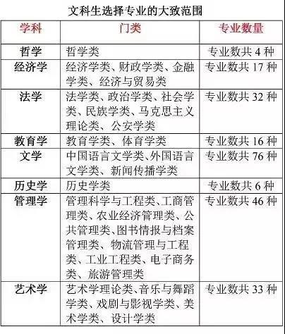 文科類專業(yè)主要分布在8個學科門 從整體上來看,文科生可選擇的專業(yè)主要集中在哲學、經(jīng)濟學、法學、教育學、文學、歷史學、管理學、藝術學等8個學科門。 我國高等學校本科教育專業(yè)設置按“學科門——專業(yè)類(一級學科)——專業(yè)(二級學科)”三個層次來設置。包括哲學、經(jīng)濟學、法學、教育學、文學、歷史學、理學、工學、農(nóng)學、醫(yī)學、管理學、藝術學12個學科門,92個專業(yè)類,506種專業(yè)。 文科專業(yè)集中的8個學科門看起來很多,但具體到一級學科(專業(yè)類)、二級學科(專業(yè)),差別就相當大了,因為500多種專業(yè)大多分布在理、工、農(nóng)、醫(yī)等門類下面,所以,文科所能報考的專業(yè)比理科要少。 大約有230種專業(yè)主要招文科生 哲學門包類括哲學、邏輯學、宗教學、倫理學等4個專業(yè),哲學一般都認為是純文科專業(yè),但也有個別院校招收理科生。 經(jīng)濟學包括經(jīng)濟學類、財政學類、金融學類、經(jīng)濟與貿(mào)易類四大類,17種專業(yè)。經(jīng)濟類中文理兼收的專業(yè)比較多,具體如金融學、財政學、國際經(jīng)濟與貿(mào)易、經(jīng)濟學等。 法學門類包括法學類、政治學類、社會學類、民族學等六大類,共32個專業(yè)。法學近年來報考比較火爆,而其中,法學、社會學、公安學類中有很多專業(yè)是文理兼收的。 教育學包括教育類、體育兩大類共16種專業(yè)。其中也有一些文理兼收的專業(yè)。 文學是文科生招生的大戶,包括中國語言文學類、外國語言文學類、新聞傳播學類三大類,共76種專業(yè)。大家熟知的漢語言文學、小語種、新聞、廣播電視、廣告、傳播學等專業(yè)都屬于這一門類。 歷史學包括一個大類,歷史、考古學、文物保護技術等6個專業(yè)。 管理學門類下設工商管理類、公共管理類、旅游管理類等9個大類,46種專業(yè)。同時也是文理兼收的招生大戶,院校開設管理類的專業(yè)比較多,文理兼收的專業(yè)主要有:會計學、工商管理、市場營銷、財務管理、公共管理、人力資源管理等等。 藝術學門類包括美術學、設計學、戲劇與影視學類等5大類,共33個專業(yè)。藝術類大多數(shù)專業(yè)都在藝術類專業(yè)目錄中查找。但也有部分院校的藝術類專業(yè)會在普通批次招生,如戲劇影視文學、廣播電視編導、動畫等等。 下面簡單列表,希望能夠讓考生家長更加明了。 所以,具體到實際報考過程中,文科生所能報考的專業(yè)就不會有這么多了?忌趫罂紩r,必須仔細閱讀自治區(qū)招生辦當年下發(fā)的《招生與考試》第三本書和各高校的招生章程,查看你所心儀的院校和專業(yè)的招生情況,以它們?yōu)橐罁?jù)填報志愿。 個別理科專業(yè)也招文科生 12個學科門類中文、理互有交叉,除了以上這些專業(yè)外,就算理、工、農(nóng)、醫(yī)這些純理科生占主導的專業(yè),也會有個別院校的個別專業(yè)會招收文科生。 醫(yī)藥類如北京中醫(yī)藥大學中醫(yī)學、針灸、護理等;成都中醫(yī)藥大學的中醫(yī)學等。農(nóng)學中的園林、園藝等專業(yè),個別院校會有文科計劃。理學中的心理學類,如北京師范大學心理學、西南大學應用心理學等,也招文科生。工學中基本都是理科生的天下,但個別院校的工業(yè)設計、城市規(guī)劃專業(yè)也會在文科中招生,但招的很少。如北京工業(yè)大學工業(yè)設計、華中科技大學的城市規(guī)劃等。 上述統(tǒng)計只能是一個大概的范圍,具體各校招生專業(yè)和招生計劃,考生家長還要以當年所在省份下發(fā)的招生專業(yè)目錄為準,文科看文科部分,理科生看理科部分,文理兼收的專業(yè)計劃也包含在文、理招生專業(yè)目錄中了。 理科生可選擇的專業(yè)更多 相對于文科生來說,理科生能選擇的專業(yè)數(shù)量要多得多,范圍也比較大,而且大多為技術型的專業(yè),一些大眾化的專業(yè)很多院校都會開設,招生人數(shù)也不少,就業(yè)相對比較容易。 為什么說理科生選專業(yè)的范圍大呢?眾所周知,所有理科類再加上文理兼收的專業(yè),理科生都可以選擇。而在目前我國高等教育本科的12個學科中,理、工、農(nóng)、醫(yī)這四個門類基本上都是理科生的天下。 文科專業(yè)中,除了文學、歷史等專業(yè)外,絕大部分專業(yè)也都可以文理兼招。 教育部頒布的《新版專業(yè)目錄》中有506種專業(yè),其中理、工、農(nóng)、醫(yī)四大門類就有276個專業(yè),占總專業(yè)數(shù)的一半以上。 這里首先說說理科生報考比較集中的四大門類。 理學中基本都是純理科專業(yè),包括數(shù)學類、物理學類、化學類、天文學類、地理學類、大氣學類等12個大類,36種專業(yè)。 工學共有31個大類,169種專業(yè),是所有學科中包含專業(yè)最多的門類,也是理科生的招生大戶。像電子信息、自動化、計算機、土木類、材料類、能源動力、航空航天等高科技、專業(yè)性強、就業(yè)好的專業(yè)都屬于該門類。 農(nóng)學門類下設植物生產(chǎn)類、動物醫(yī)學類、林學類、水產(chǎn)類等7個大類,27種專業(yè)。農(nóng)學專業(yè)基本都招理科生,只有少數(shù)如園林、園藝等專業(yè),個別院校會有文科計劃。近兩年,在國家大環(huán)境的作用下,農(nóng)學又有回暖的趨勢,很多農(nóng)學類