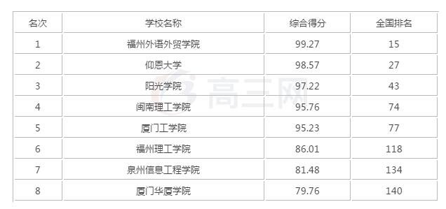 在福建民辦大學最新排名中,福州外語外貿學院排名第一,仰恩大學排名第二,陽光學院排名第三。具體排名如下: