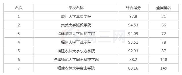 在福建獨立學院最新排行榜中,廈門大學嘉庚學院排名第一,集美大學誠毅學院位居第二,福建師范大學協(xié)和學院排名第三。具體排名如下: