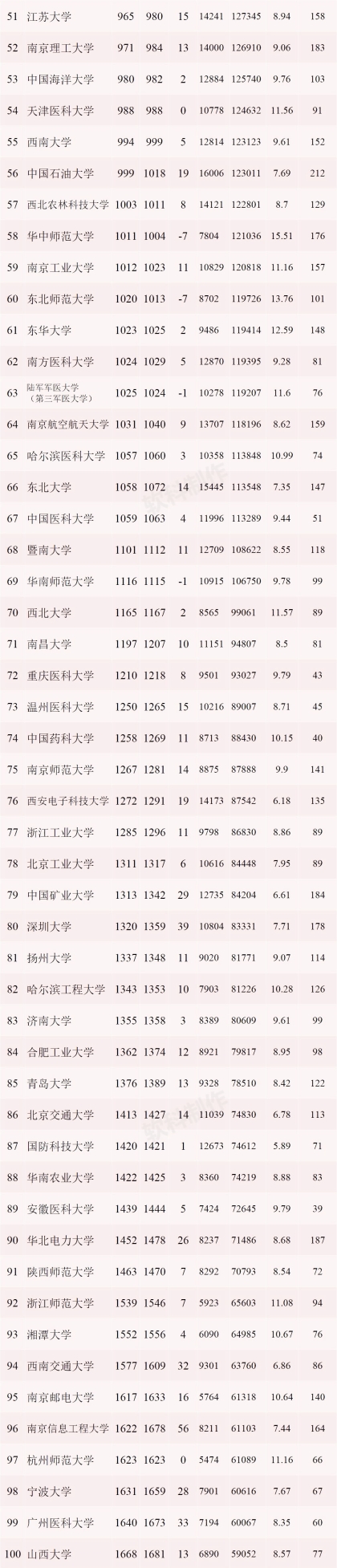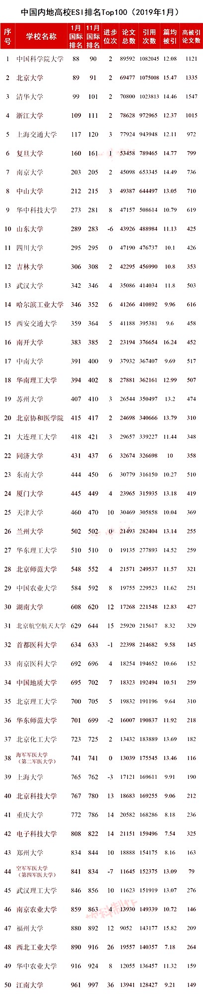 與2018年11月的ESI數(shù)據(jù)相比,本次共有23所中國內(nèi)地高校新增1個(gè)ESI前1%學(xué)科。其中,有4所高校首次擁有ESI前1%學(xué)科,它們是煙臺(tái)大學(xué)、山東理工大學(xué)、北京工商大學(xué)和上海電力學(xué)院,4所高校目前均擁有1個(gè)ESI前1%學(xué)科。 從各大高校的統(tǒng)計(jì)結(jié)果來看,在本期ESI數(shù)據(jù)中,擁有10個(gè)及以上ESI前1%學(xué)科的中國內(nèi)地高校共有25所,其中武漢大學(xué)、四川大學(xué)、中南大學(xué)各新增1個(gè)ESI前1%學(xué)科。 北京大學(xué)共擁有21個(gè)ESI前1%學(xué)科,數(shù)量位居各高校之首。清華大學(xué)、上海交通大學(xué)和中山大學(xué)緊隨其后,均擁有19個(gè)ESI前1%學(xué)科。復(fù)旦大學(xué)和浙江大學(xué)均擁有18個(gè)ESI前1%學(xué)科。中國科學(xué)院大學(xué)是擁有前1%學(xué)科數(shù)量最多的一流學(xué)科建設(shè)高校,共有17個(gè),數(shù)量較2018年11月保持不變。 從國際排名來看,各大高校的國際排名略有起伏,但變化不大。中國科學(xué)院大學(xué)依舊位居國內(nèi)高校第一名,國際排名第88位, 較2018年11月上升2個(gè)名次。北京大學(xué)和清華大學(xué)攜手挺進(jìn)全球百強(qiáng),分別位列第89位和第99位,均上升2個(gè)名次。進(jìn)入全球前200名的中國內(nèi)地高校還有浙江大學(xué)、上海交通大學(xué)和復(fù)旦大學(xué)。 中國內(nèi)地高校ESI百強(qiáng)中,進(jìn)步最大的當(dāng)屬南京信息工程大學(xué),國際排名上升了56個(gè)名次。進(jìn)步名次超過30名的高校還有深圳大學(xué)、江南大學(xué)、廣州醫(yī)科大學(xué)和西南交通大學(xué)。 中國內(nèi)地ESI綜合排名前100的高校: 以上為各高校最新ESI排名情況。