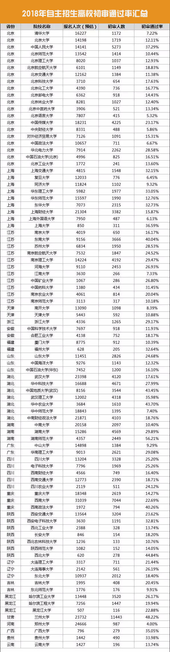 【摘要】2019年自主招生報(bào)考臨近,許多家長在進(jìn)行擇校時(shí)會將高校初審?fù)ㄟ^率作為報(bào)考依據(jù),為此,小編綜合整理2018年高校自主招生通過率情況,并給予相關(guān)報(bào)考建議,供2019年考生參考。更多高考信息可關(guān)注閩州教育高考資訊專欄。