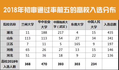 一、2018年高校自主招生初審?fù)ㄟ^率 自主招生初審?fù)ㄟ^率即當(dāng)年高校公布的初審人數(shù)占報(bào)名人次的百分比。 高校自主招生初審?fù)ㄟ^率每年都會隨著報(bào)名人數(shù)和高校招生政策變化有所浮動(dòng),因此,往年高校自主招生初審?fù)ㄟ^率僅作為院校選擇的參考依據(jù)之一。 以下為2018年自主招生高校初審?fù)ㄟ^率,如圖所示: 說明:以下報(bào)名人次為估算值,并非實(shí)際報(bào)名人數(shù),所以初審?fù)ㄟ^率僅供大致參考。 二、院校報(bào)考注意事項(xiàng) 報(bào)考初審?fù)ㄟ^率高的院校需要注意以下幾點(diǎn): 1、高校今年報(bào)名人數(shù)可能會持續(xù)上升 依據(jù)往年自主招生報(bào)名情況顯示,初審?fù)ㄟ^率高的院校會吸引大量考生報(bào)名。如果高校初審名額有限,而報(bào)名人數(shù)上升,考生的競爭壓力必然增加。 2、高?荚嚫偁帀毫赡軙黾 自主招生高校一直遵循優(yōu)中選優(yōu)原則招錄考生,如果報(bào)名人數(shù)增加,初審人數(shù)增加,考試必然更加嚴(yán)格,考試競爭壓力增加。 3、需考慮學(xué)校招生地域偏好 大部分高校招生有或多或少的地域偏好,家長和考生需提前研究高校招生情況。 盤點(diǎn)2018年高校自主招生情況,除對本省招生的高校外,蘭州大學(xué)、華中農(nóng)業(yè)大學(xué)、中國地質(zhì)大學(xué)(武漢)、東南大學(xué)、人民大學(xué)這5所高校自主招生初審?fù)ㄟ^率最高。 2018年初審?fù)ㄟ^率前五的高校入選分布情況如圖所示: 4、警惕學(xué)校政策調(diào)整 (1)招生條件、優(yōu)惠政策變化 往年部分高校招生條件、優(yōu)惠政策等調(diào)整,導(dǎo)致當(dāng)年報(bào)名人數(shù)變動(dòng)大,從而影響初審人數(shù)。如南京大學(xué)2018年自主招生報(bào)名條件從雙省二提高到省一,導(dǎo)致當(dāng)年報(bào)名人數(shù)大幅度降低,初審?fù)ㄟ^人數(shù)減少。 (2)初審審核變化 部分高校因往年報(bào)名人數(shù)多、初審人數(shù)較多,來年對初審審核環(huán)節(jié)可能會把控更加嚴(yán)格。如中南財(cái)經(jīng)政法大學(xué)2018年自主招生計(jì)劃數(shù)增加,初審?fù)ㄟ^人數(shù)卻大幅度減少。 家長和考生進(jìn)行自主招生擇校定位時(shí)需考慮多方因素,并結(jié)合自身綜合實(shí)力報(bào)考。預(yù)?忌鷤2019年自主招生報(bào)考順利,考上理想的高校。