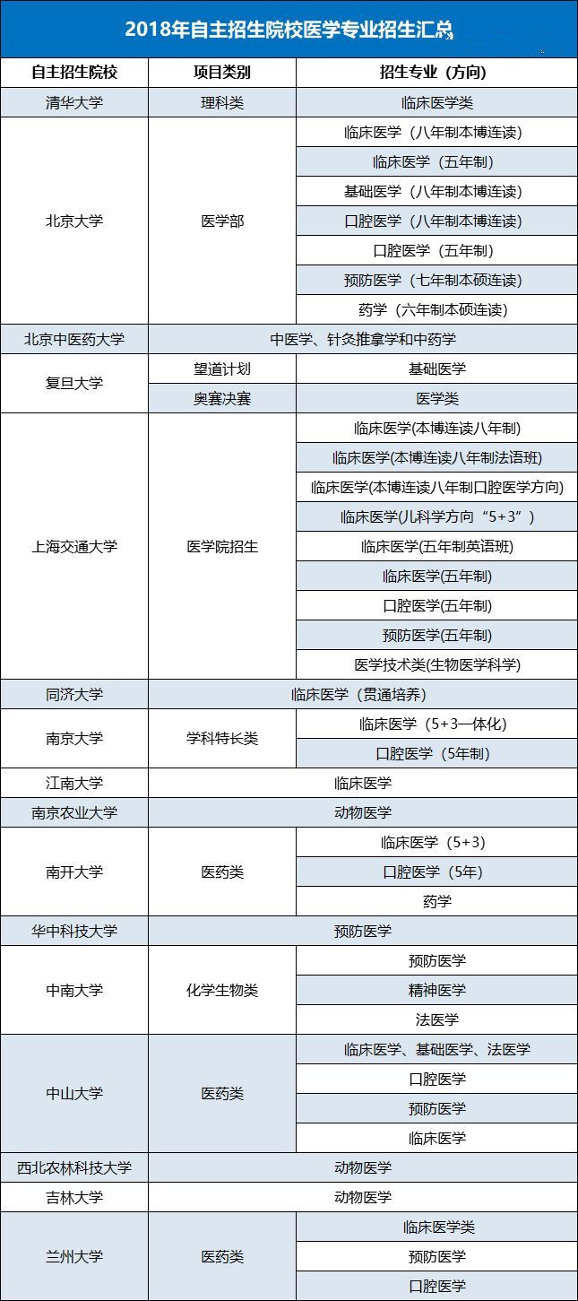 2018年自主招生院校醫(yī)學(xué)類專業(yè)匯總