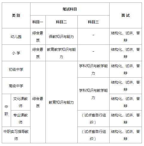注2:幼兒園面試不分科目,小學(xué)面試科目分語(yǔ)文、英語(yǔ)、社會(huì)、數(shù)學(xué)、科學(xué)、音樂(lè)、體育、美術(shù),中學(xué)面試科目與科目三相一致。