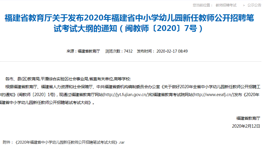 福建省教育廳關(guān)于發(fā)布2020年福建省中小學(xué)幼兒園新任教師公開招聘筆試考試大綱的通知(閩教師〔2020)7號(hào))