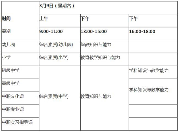 2019年上半年NTCE筆試日期為3月9日,各科目考試時間為120分鐘,具體日程安排如下表: