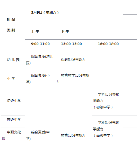 (四)全國統(tǒng)一考試日期3月9日,各類別考試科目與時間安排如下: