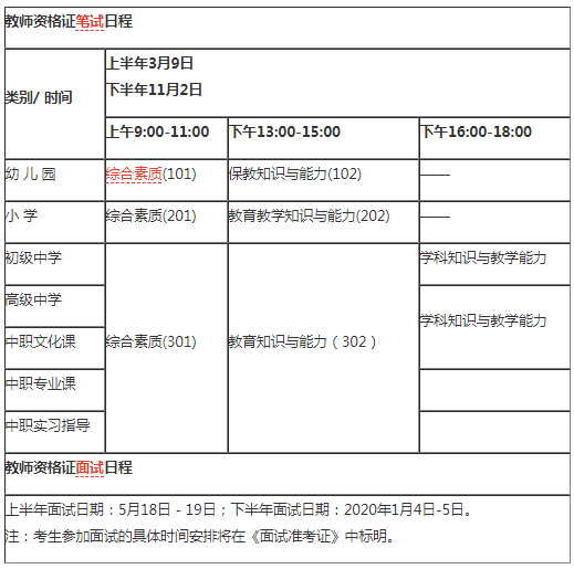 2019年教師資格證考試日程安排如下: