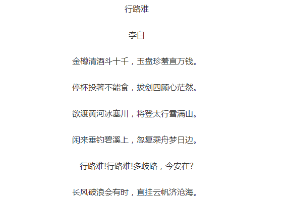 對(duì)于《行路難》這一課,我將知識(shí)與能力目標(biāo)設(shè)置為反復(fù)誦讀,做到有感情地朗讀并背誦全詩(shī),了解李白生平和作品風(fēng)格。而過程與方法目標(biāo),則是學(xué)生通過本課的學(xué)習(xí),提高學(xué)生的古詩(shī)鑒賞能力。情感態(tài)度與價(jià)值觀目標(biāo)是體會(huì)詩(shī)人悲憤中不乏豪邁,失意中仍懷希望的思想境界。