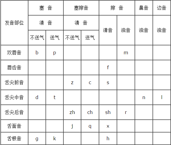 聲母是漢語音節(jié)開頭的輔音。普通話有21個(gè)輔音聲母,不同的聲母是由不同的發(fā)音部位和發(fā)音方法決定的。發(fā)音部位指氣流受到阻礙的位置。發(fā)音方法阻礙氣流和解除阻礙的方式、氣流的強(qiáng)弱及聲帶是否顫動(dòng)等,按發(fā)音部位給聲母分類可分為七類:雙唇音,唇齒音、舌尖前音、舌尖中音、舌尖后音、舌面音、舌根音。按發(fā)音方法分類,聲母可分為五類:塞音、擦音、塞擦音、鼻音、邊音。