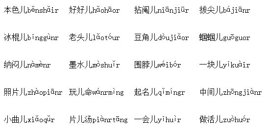 號碼兒hǎomǎr 山坡兒shānpōr 飯盒兒fànhér 水珠兒shuǐzhūr