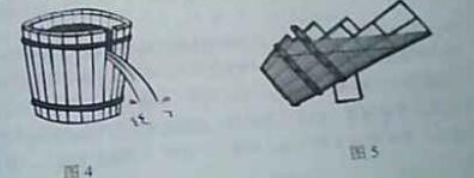 “木桶原理”認(rèn)為,一個木桶能裝多少水,取決于最短的那個板(圖4)進(jìn)來又有人提出了“新木桶原理”,認(rèn)為當(dāng)木桶傾料一定角度后所能裝的水,才是它的真正容量,也就是說,木桶的長板越長,裝的水越多。