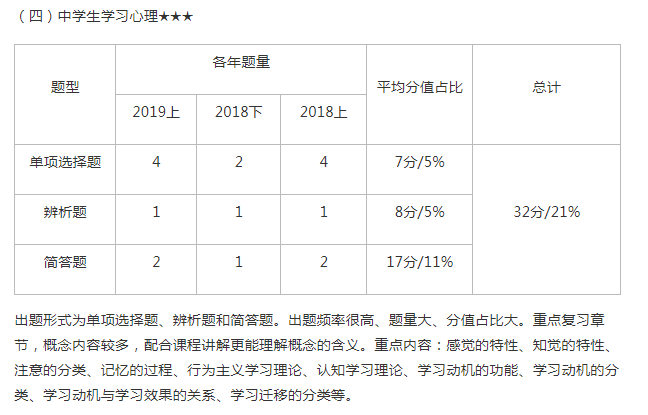 出題形式為單項(xiàng)選擇題、辨析題和簡(jiǎn)答題。涉及題型廣,題量大,分值占比很高。為重點(diǎn)復(fù)習(xí)章節(jié),建議學(xué)習(xí)兩遍,充分理解各概念、定義。重點(diǎn)內(nèi)容:教育的功能、教育學(xué)的概念、著名教育家的教育思想、個(gè)體身心發(fā)展的動(dòng)因、教育目的的功能等。