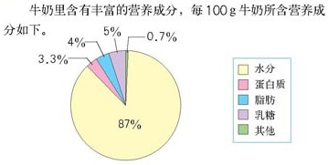 生2:我知道每100牛奶里水分占87%、蛋白質占3.3%、脂肪占4%、乳糖占5%、其他營養(yǎng)成分占0.7%。