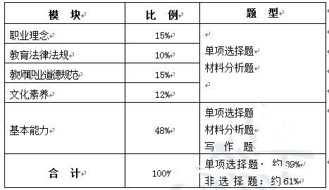 綜合素質科目共包含五個模塊:職業(yè)理念、教師職業(yè)道德規(guī)范、教育法律法規(guī)、文化素養(yǎng)、基本能力。