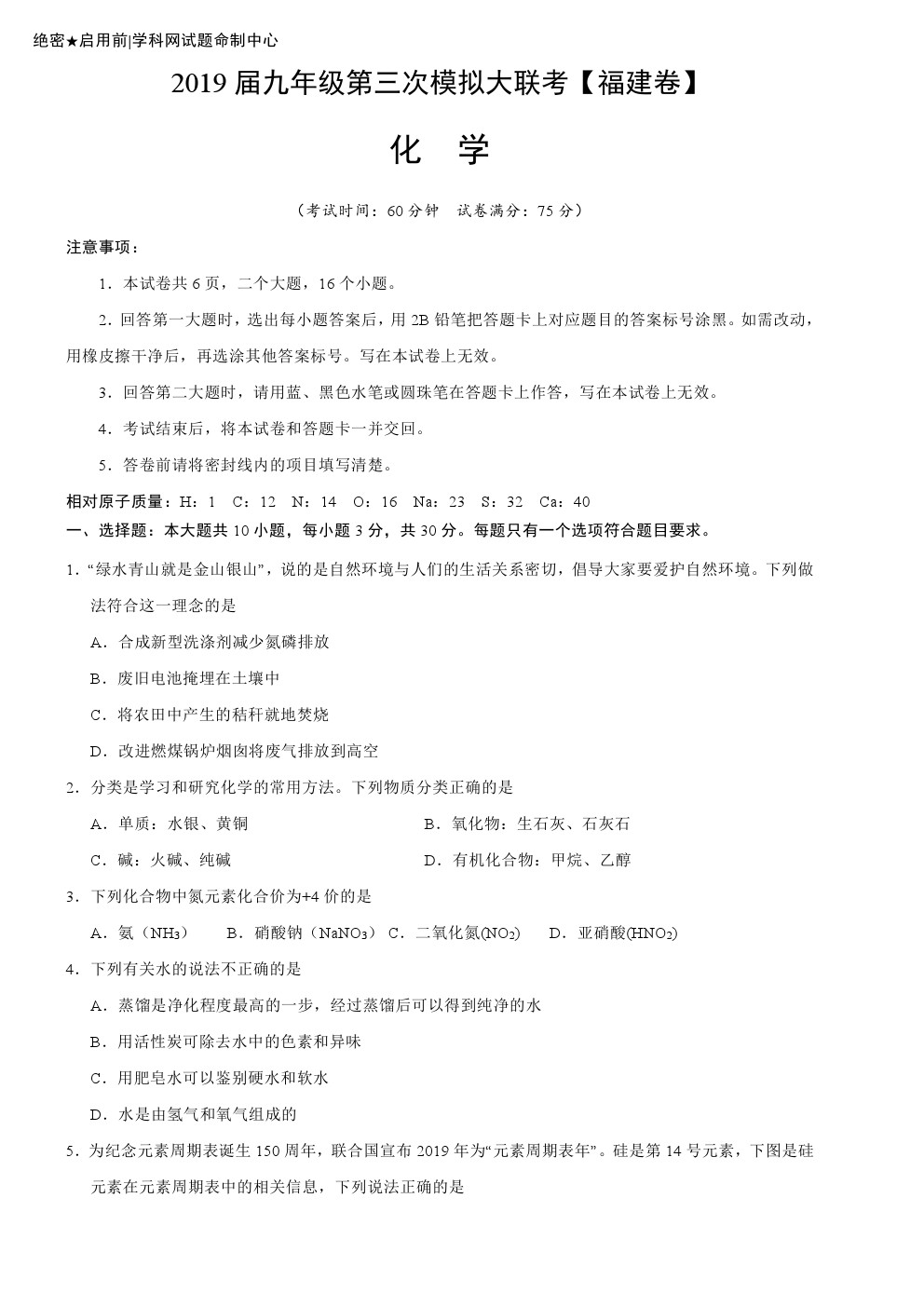 【摘要】2019屆九年級(jí)第三次模擬大聯(lián)考(福建卷)化學(xué)試題!更多中考信息可關(guān)注閩州教育中考資訊專欄。