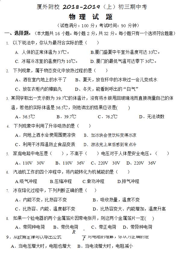 【摘要】福建省廈門外國語學(xué)校海滄附屬學(xué)校2019屆九年級上學(xué)期期中考試物理試題,更多中考信息可關(guān)注閩州教育中考資訊專欄。