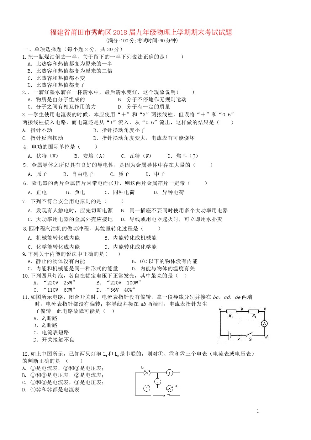 【摘要】福建省莆田市秀嶼區(qū)2018屆九年級物理上學期期末考試試題及答案,供考生參考,更多中考信息可關(guān)注閩州教育中考資訊專欄。