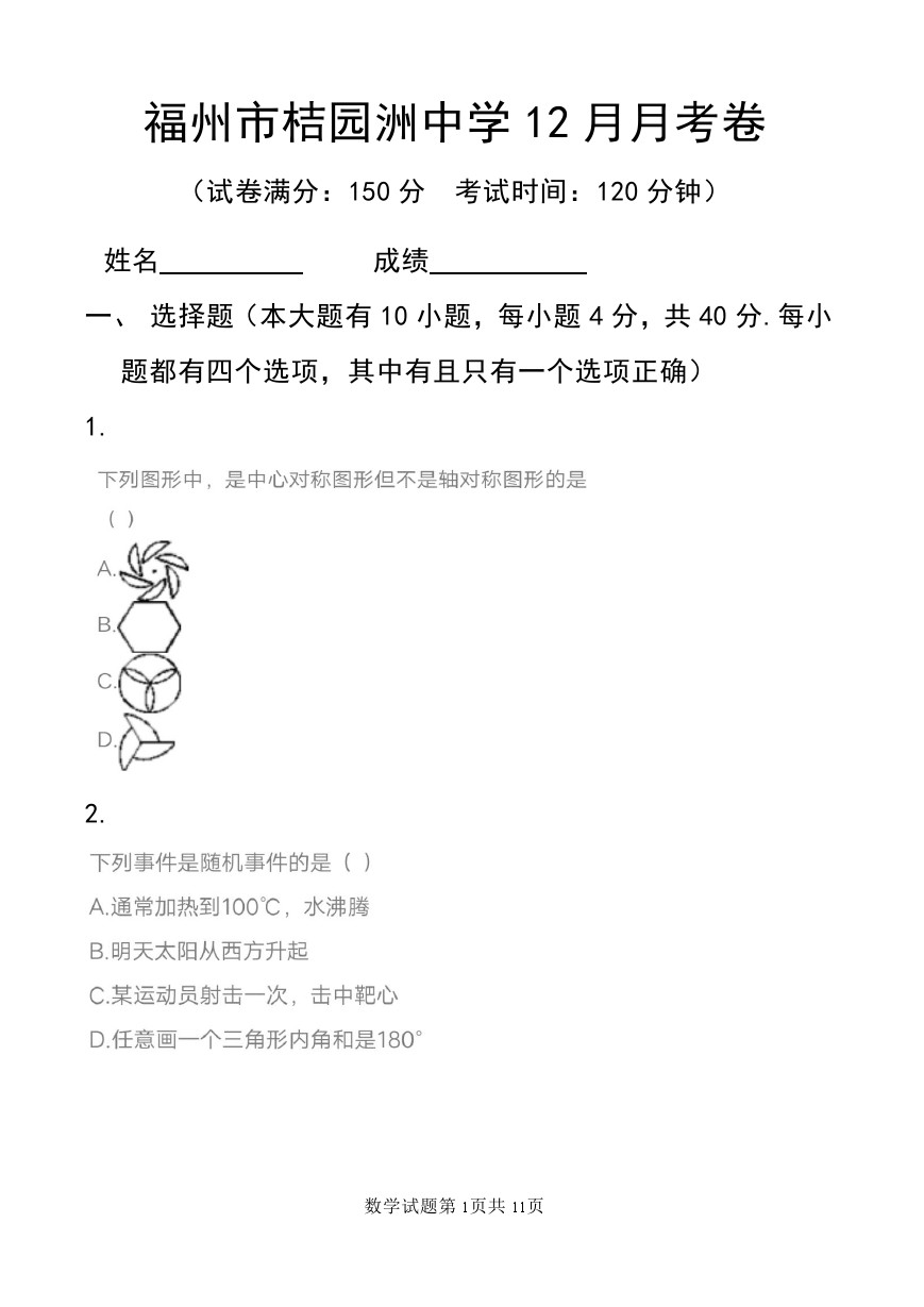 【摘要】福州桔園洲中學(xué)2018-2019學(xué)年九年級數(shù)學(xué)12月月考試題,更多中考信息可關(guān)注閩州教育中考資訊專欄。