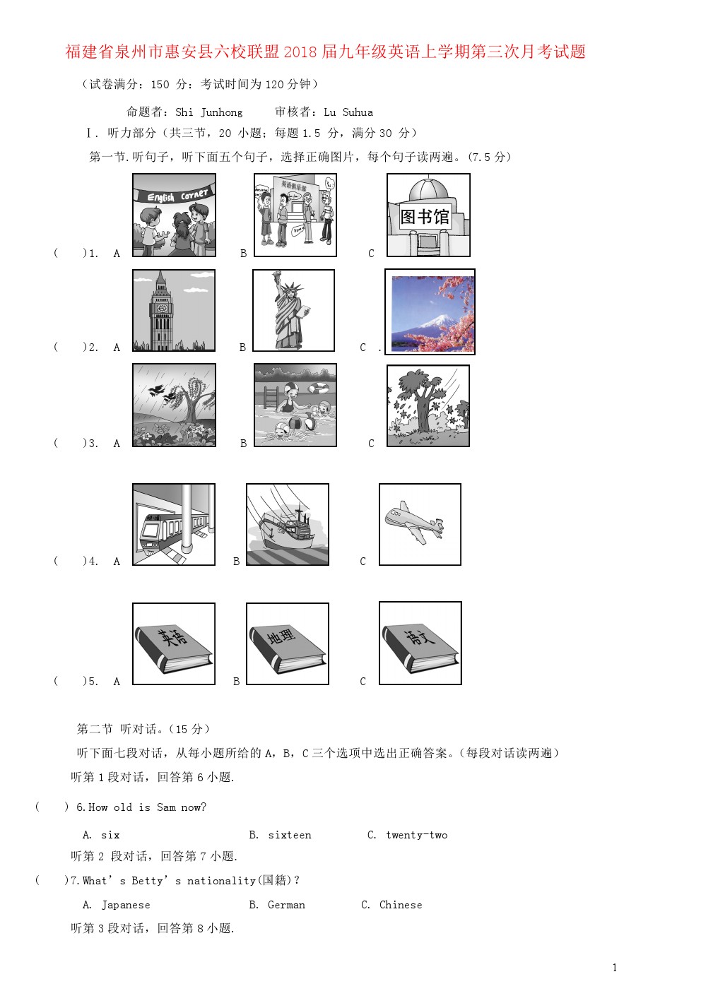 【摘要】福建省泉州市惠安縣六校聯(lián)盟2018屆九年級(jí)英語上學(xué)期第三次月考試題及答案!更多中考信息可關(guān)注閩州教育中考資訊專欄。