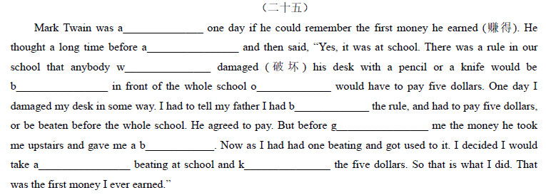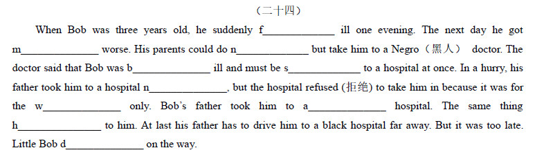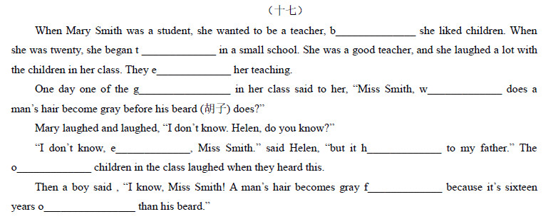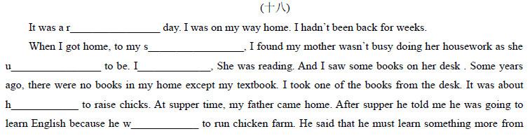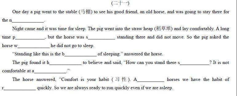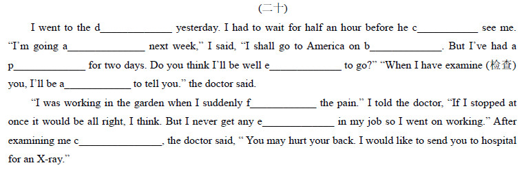 【摘要】初三學(xué)生開學(xué)之后就要進(jìn)入緊張的復(fù)習(xí)階段,除了要應(yīng)付新學(xué)科化學(xué)之外,其它科目的復(fù)習(xí)工作也應(yīng)該有條不紊地展開。在此,小編在大家復(fù)習(xí)前為大家整理了中考英語首字母填空訓(xùn)練提高題系列,希望能幫助到大家!更多中考信息可關(guān)注閩州教育中考資訊專欄。