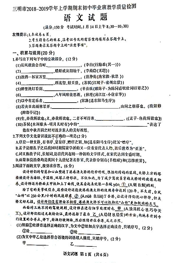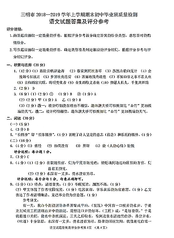 【摘要】福建省三明市2018-2019學(xué)年九年級(jí)上學(xué)期期末質(zhì)量檢測(cè)語(yǔ)文試題及答案。更多中考信息可關(guān)注閩州教育中考資訊專欄
