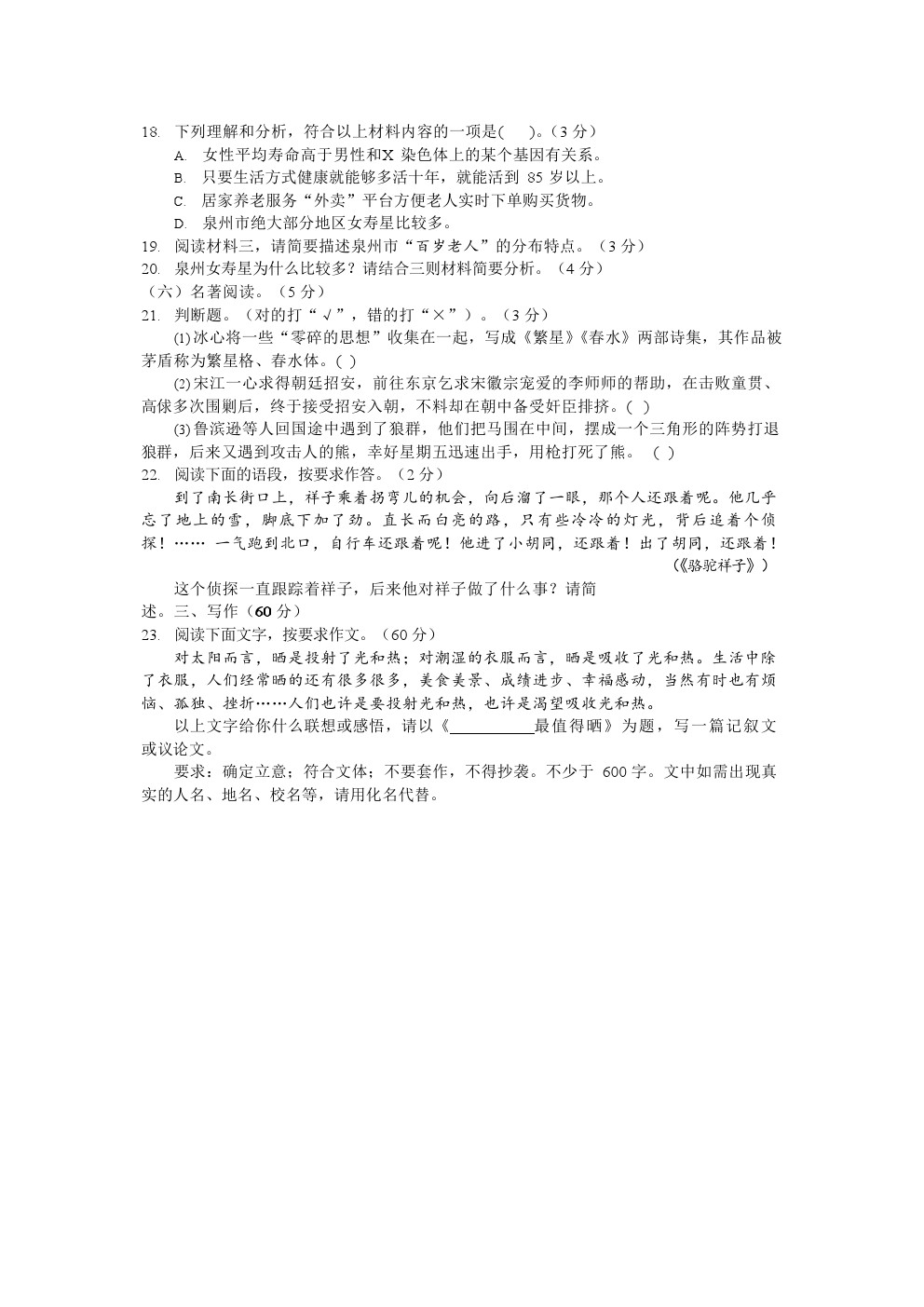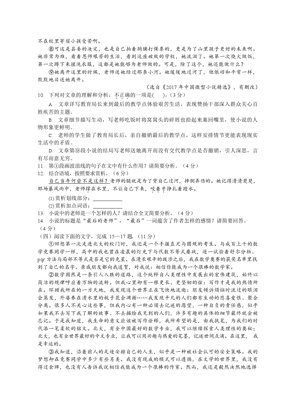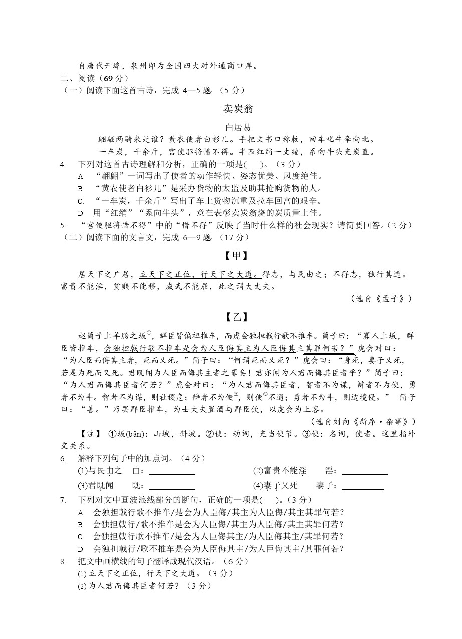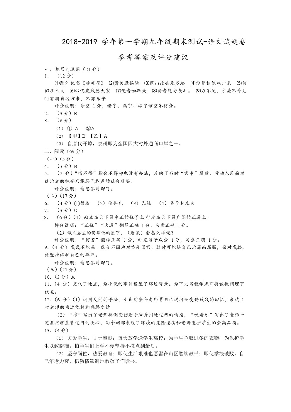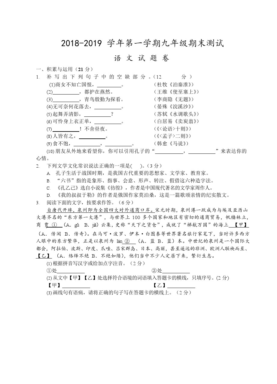 【摘要】福建泉州市2018-2019 學(xué)年上學(xué)期九年級(jí)期末測(cè)試-語(yǔ)文試題及答案!更多中考信息可關(guān)注閩州教育中考資訊專(zhuān)欄。