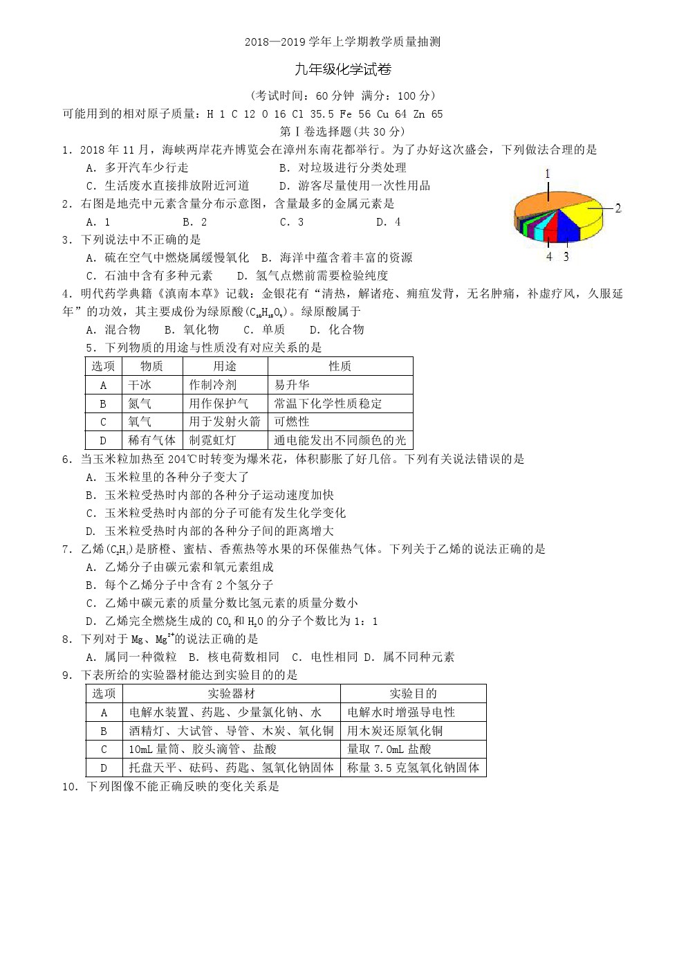 【摘要】福建省漳州市2018-2019學年九年級上學期教學質(zhì)量抽測化學試題!更多中考信息可關(guān)注閩州教育中考資訊專欄。
